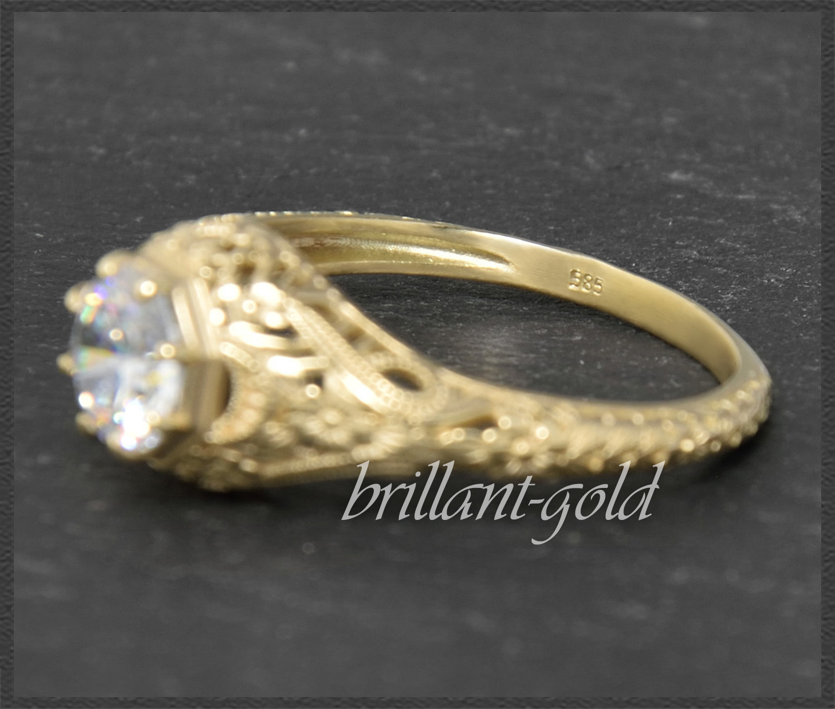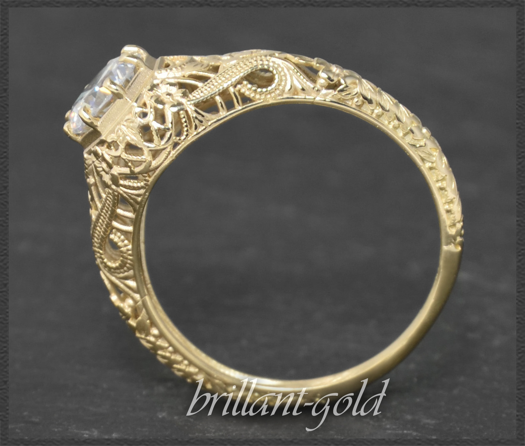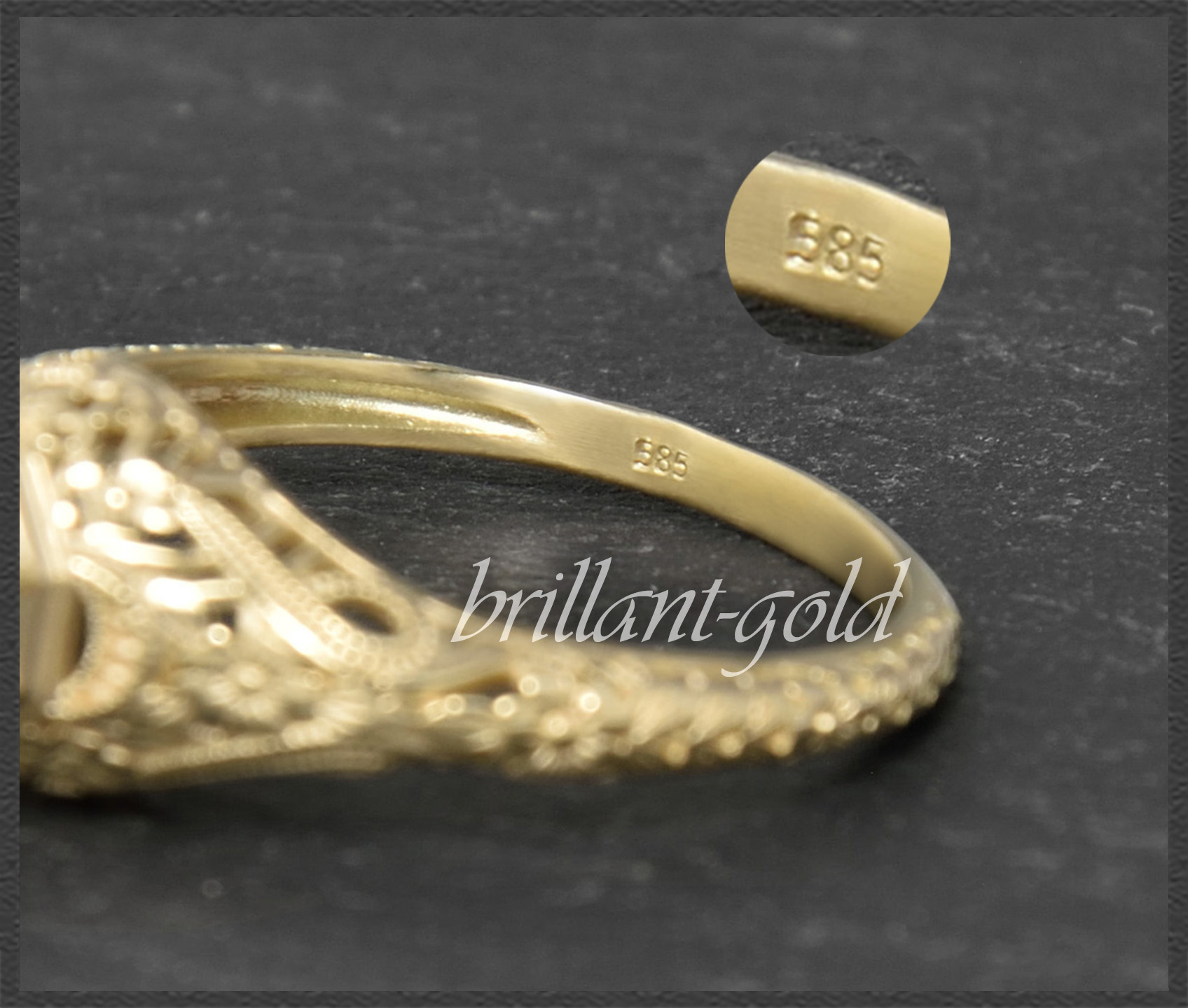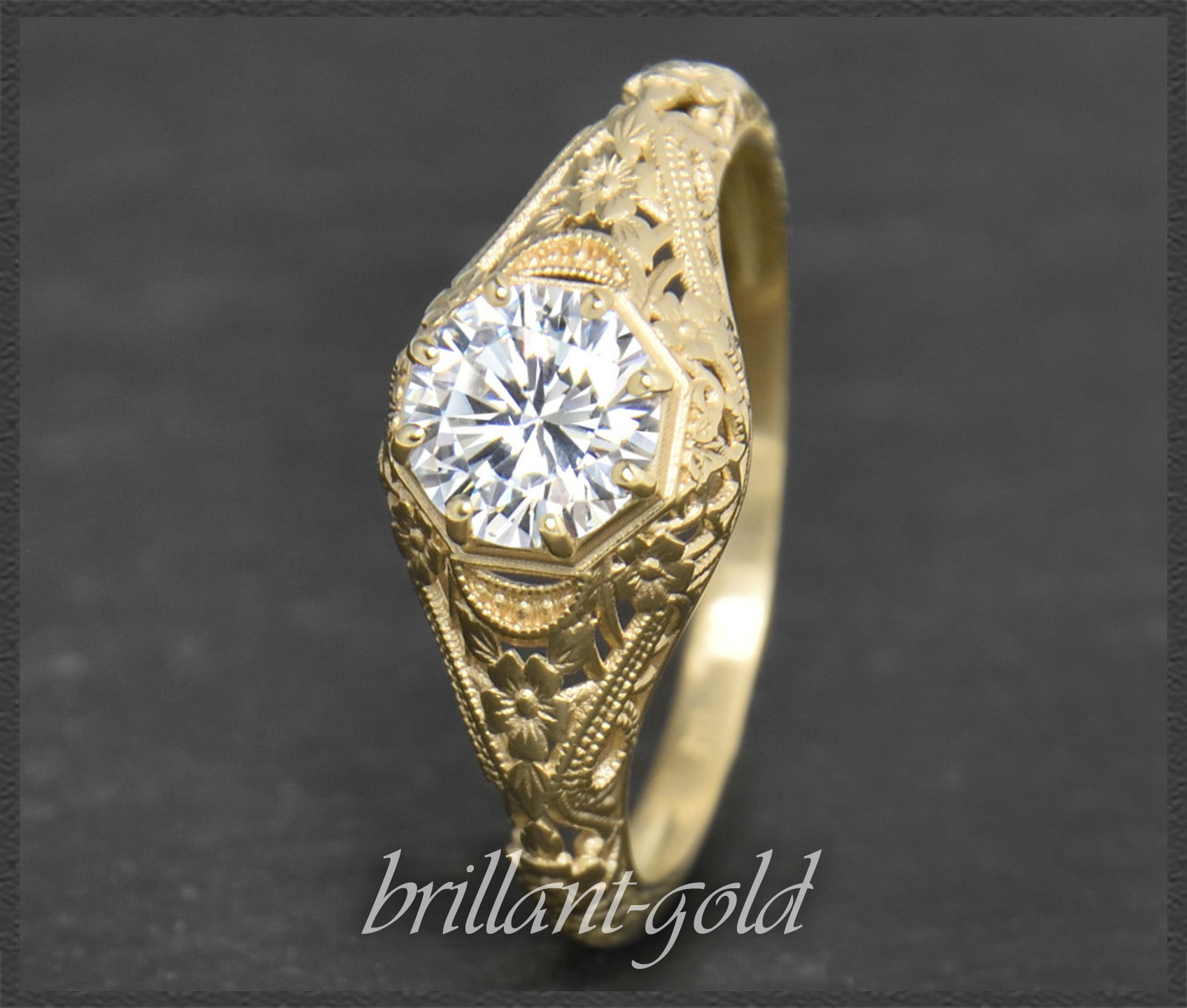 Designer Ring mit floralen Verzierungen, Blüten & Blättern, wie es in der Zeit des Jugendstil üblich war. Die Verzierungen sind filigran gearbeitet, der Brillantring sieht dadurch sehr elegant aus. Hergestellt aus 585 Gelbgold, hochglanz-polierte Oberfläche.