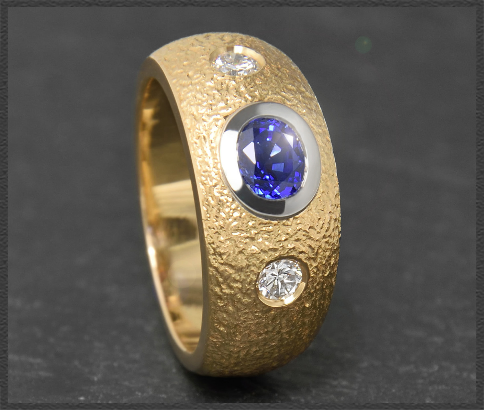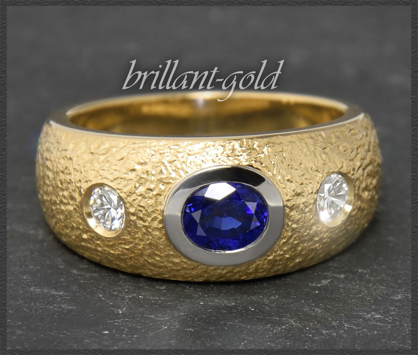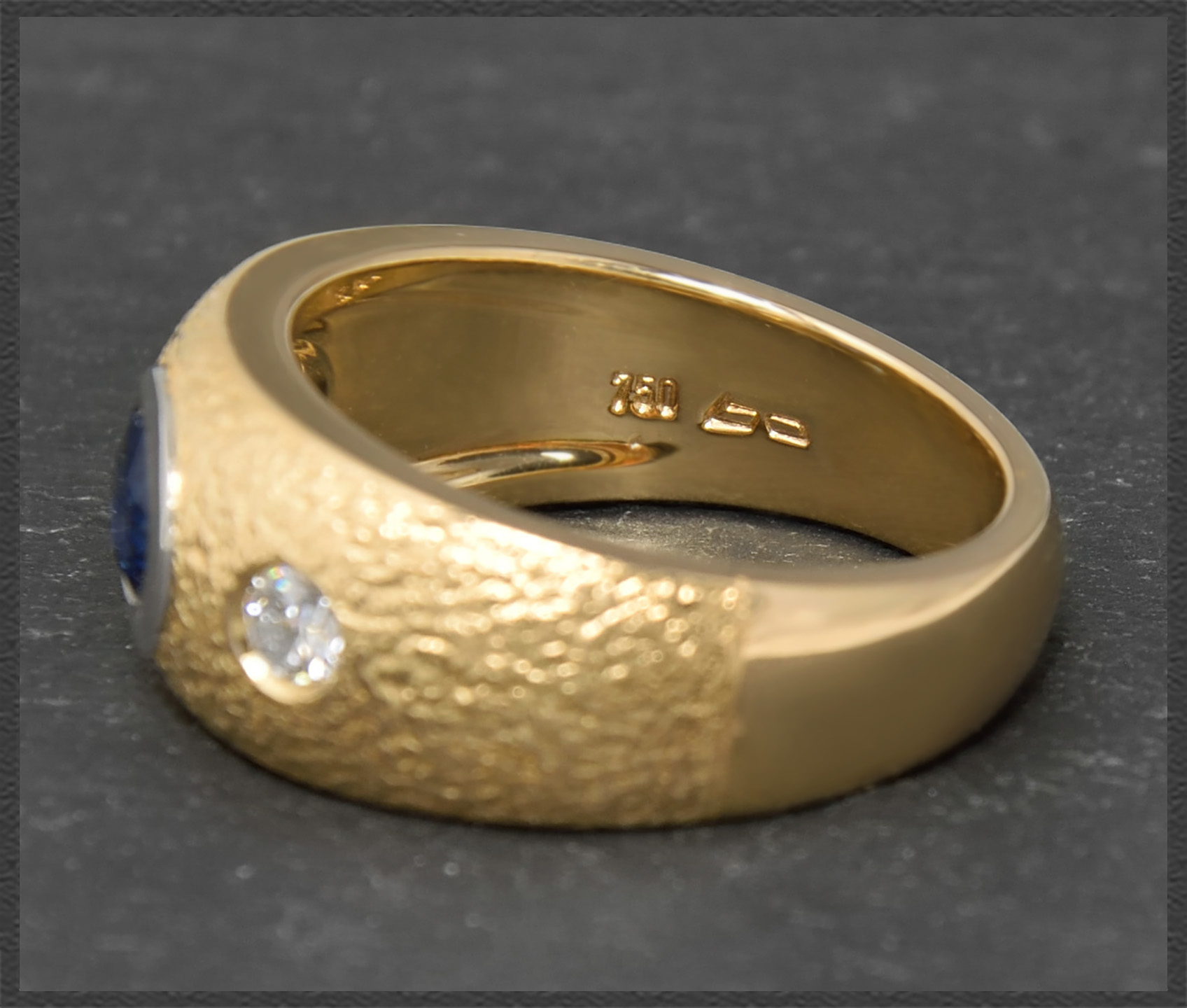 Hergestellt vom Goldschmied in Handarbeit (Meisterpunze im Ring) aus massivem 750 Gelbgold, die Saphir Fassung ist aus 750 Weißgold, grob-mattes & poliertes Finish.