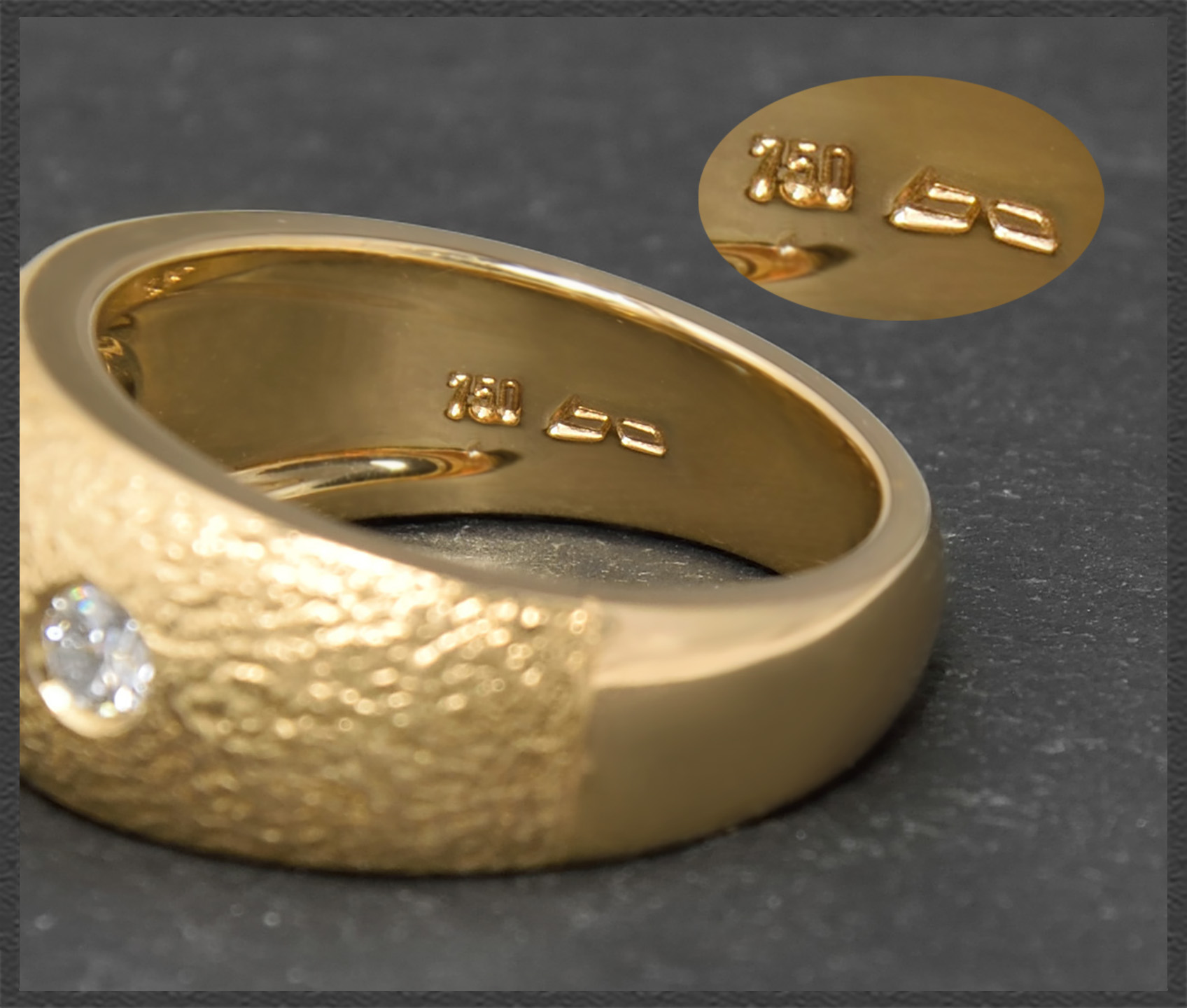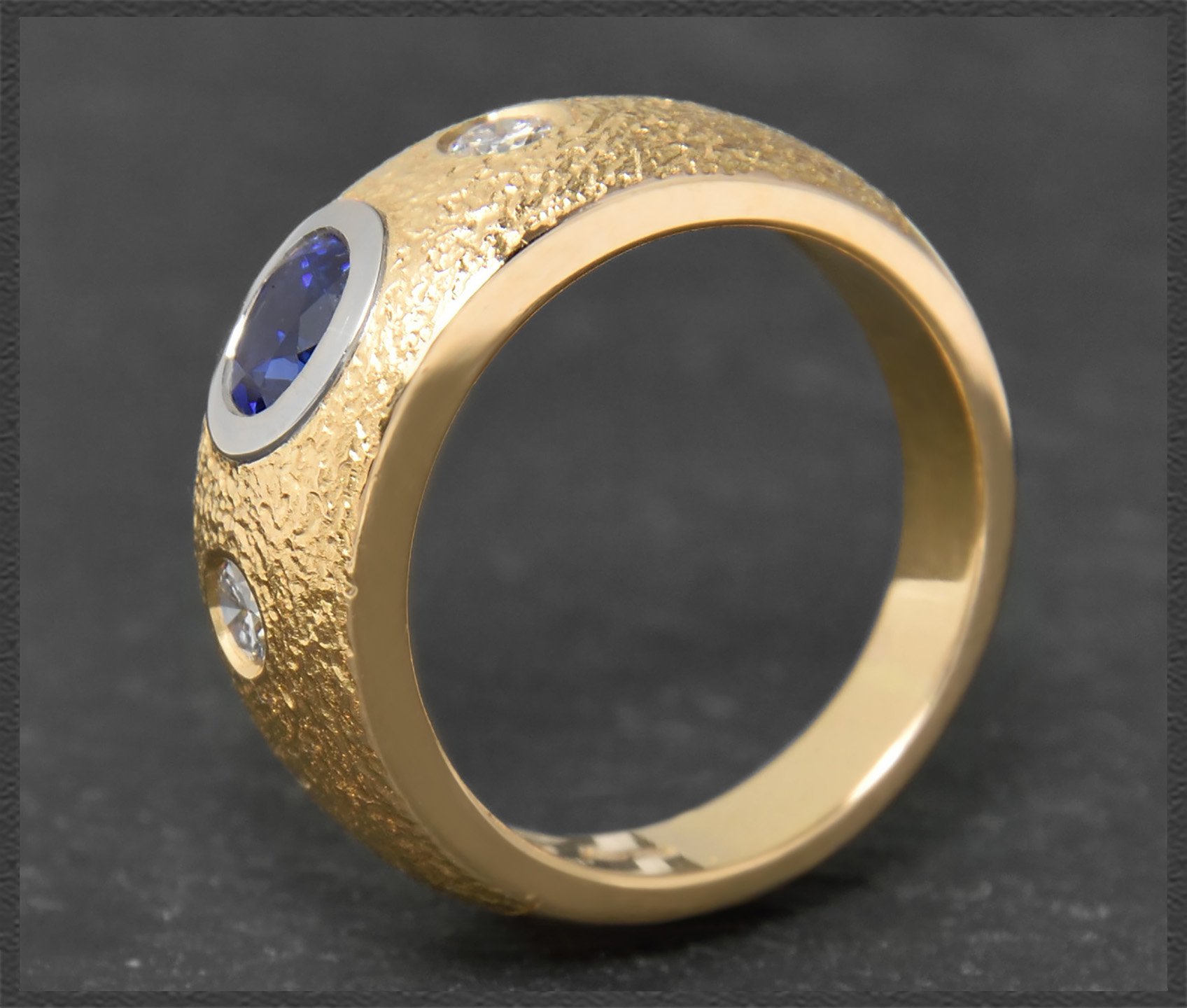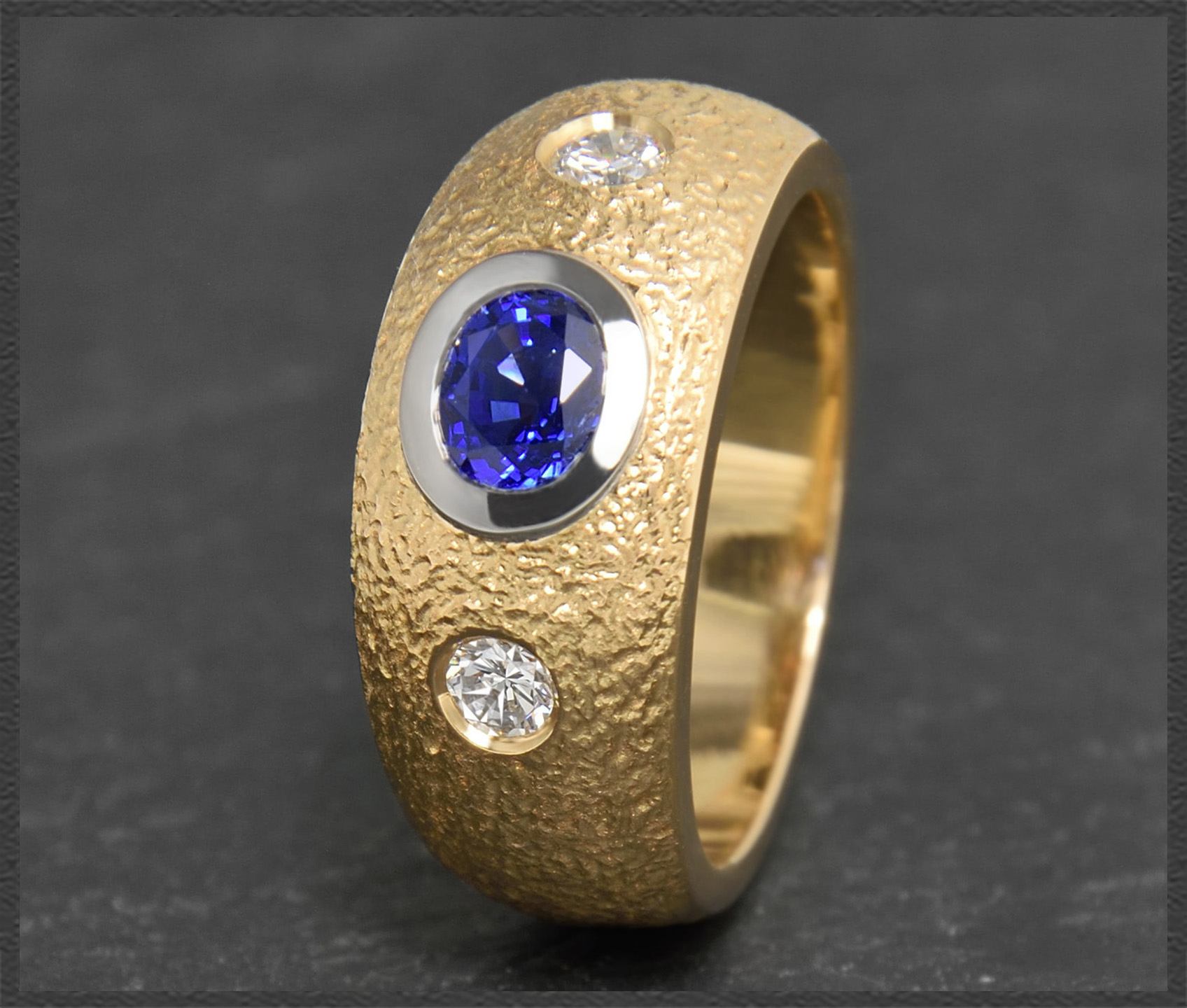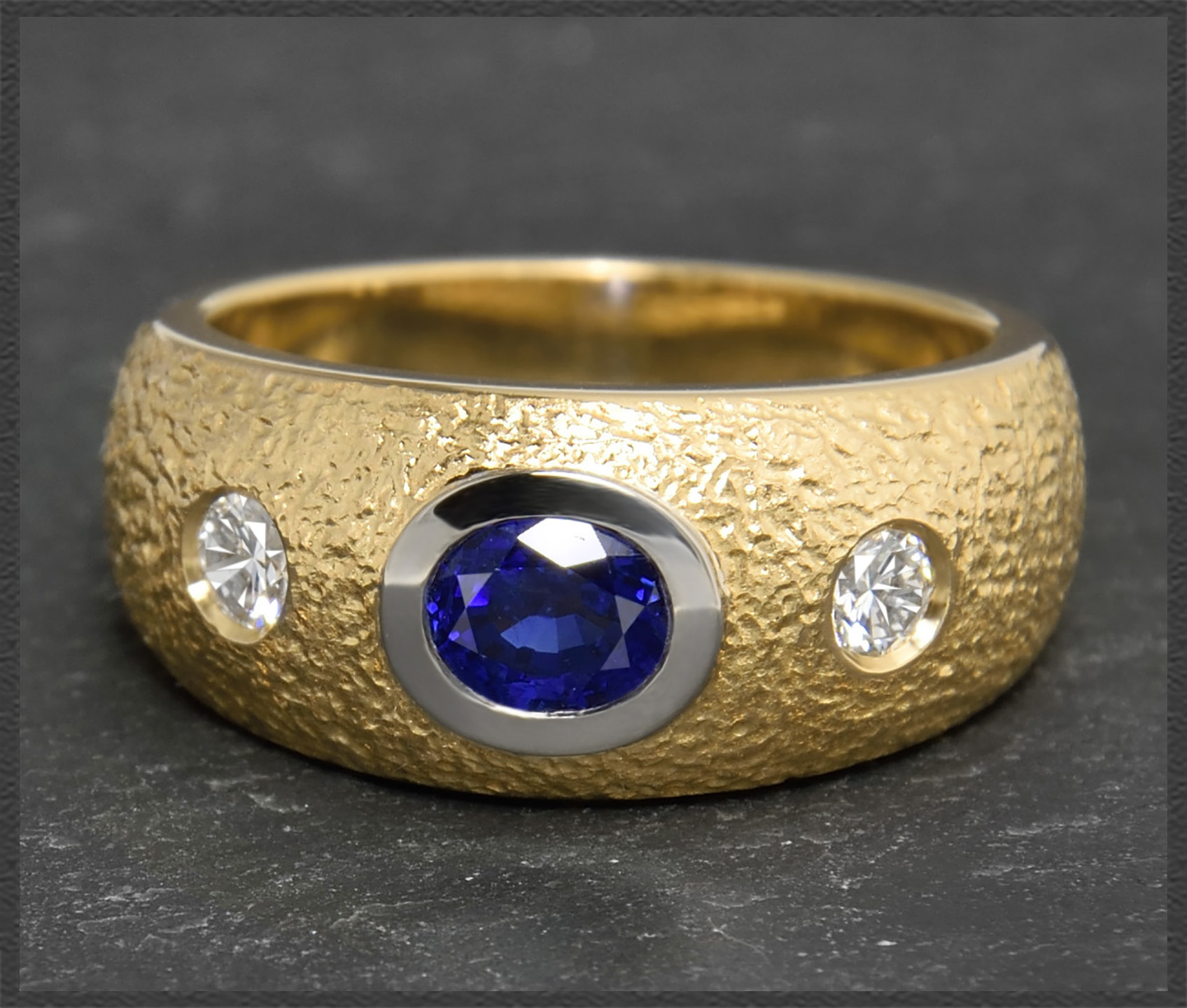 Hergestellt vom Goldschmied in Handarbeit (Meisterpunze im Ring) aus massivem 750 Gelbgold, die Saphir Fassung ist aus 750 Weißgold, grob-mattes & poliertes Finish.