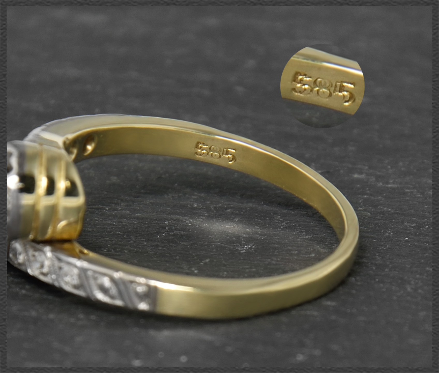 Zentral im Ring sind versetzt zwei größere Diamanten eingefasst, ein Antiker Altschliff Brillant mit 0,60ct und ein lupenreiner Brillant mit 0,30ct, seitlich zieren kleinere Diamanten den Ring. Der Begiff "toi et moi" spielt darauf an, dass die etwa gleich großen Diamanten zwei Liebende darstellen.