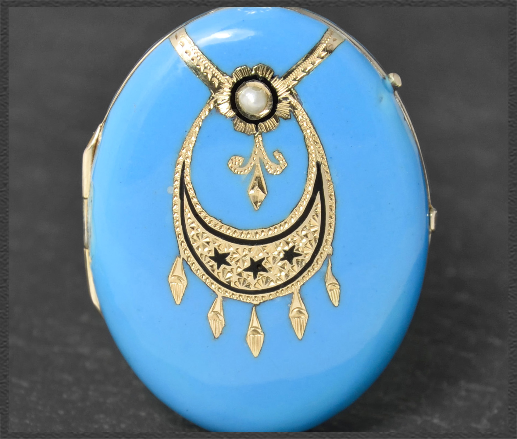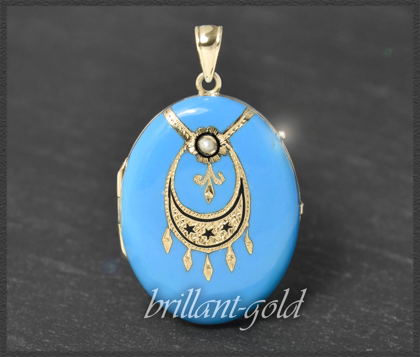 Antikes Gold Medaillon von ca 1880, verziert mit Email, Handgravur und einer weißen Perle.