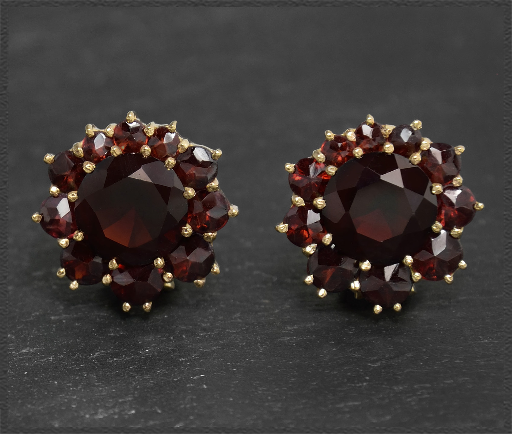 Elegante Vintage Ohrclips mit 6,40ct intensiv roten Granaten. Zentral eingefasst sind große Granate mit je 2ct, rundererum werden sie von kleineren Granaten geschmückt.