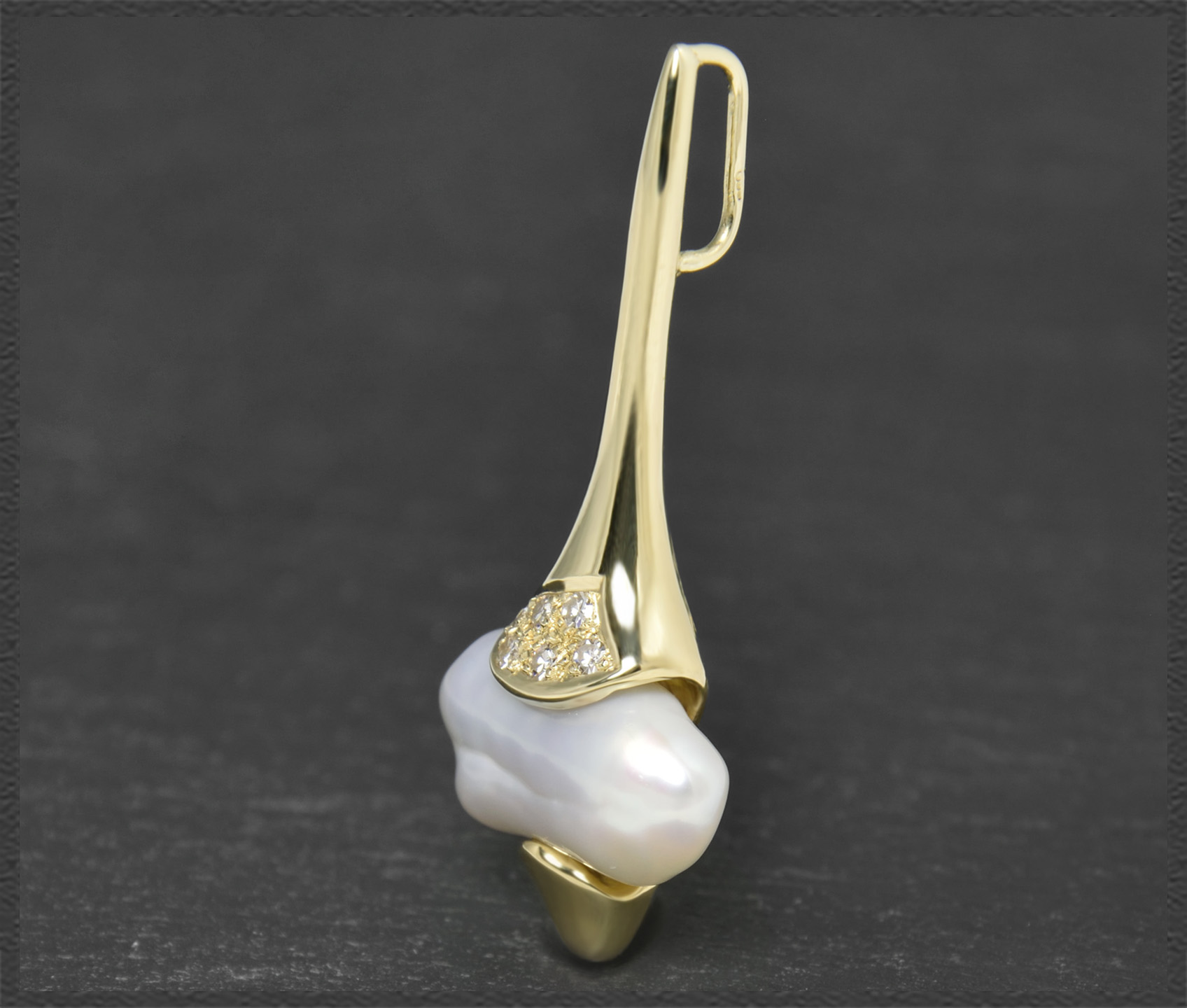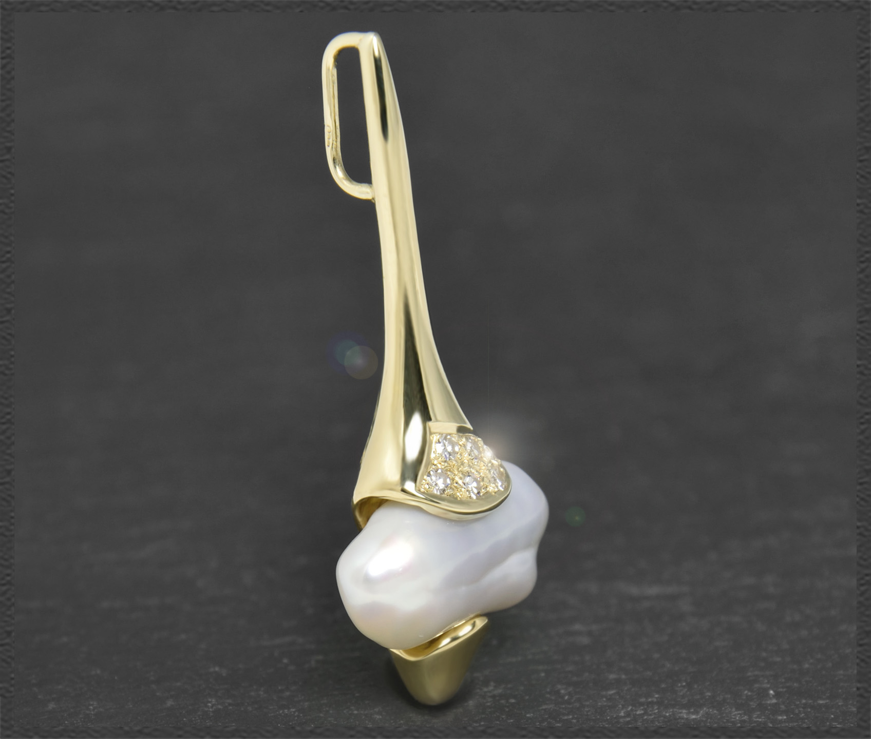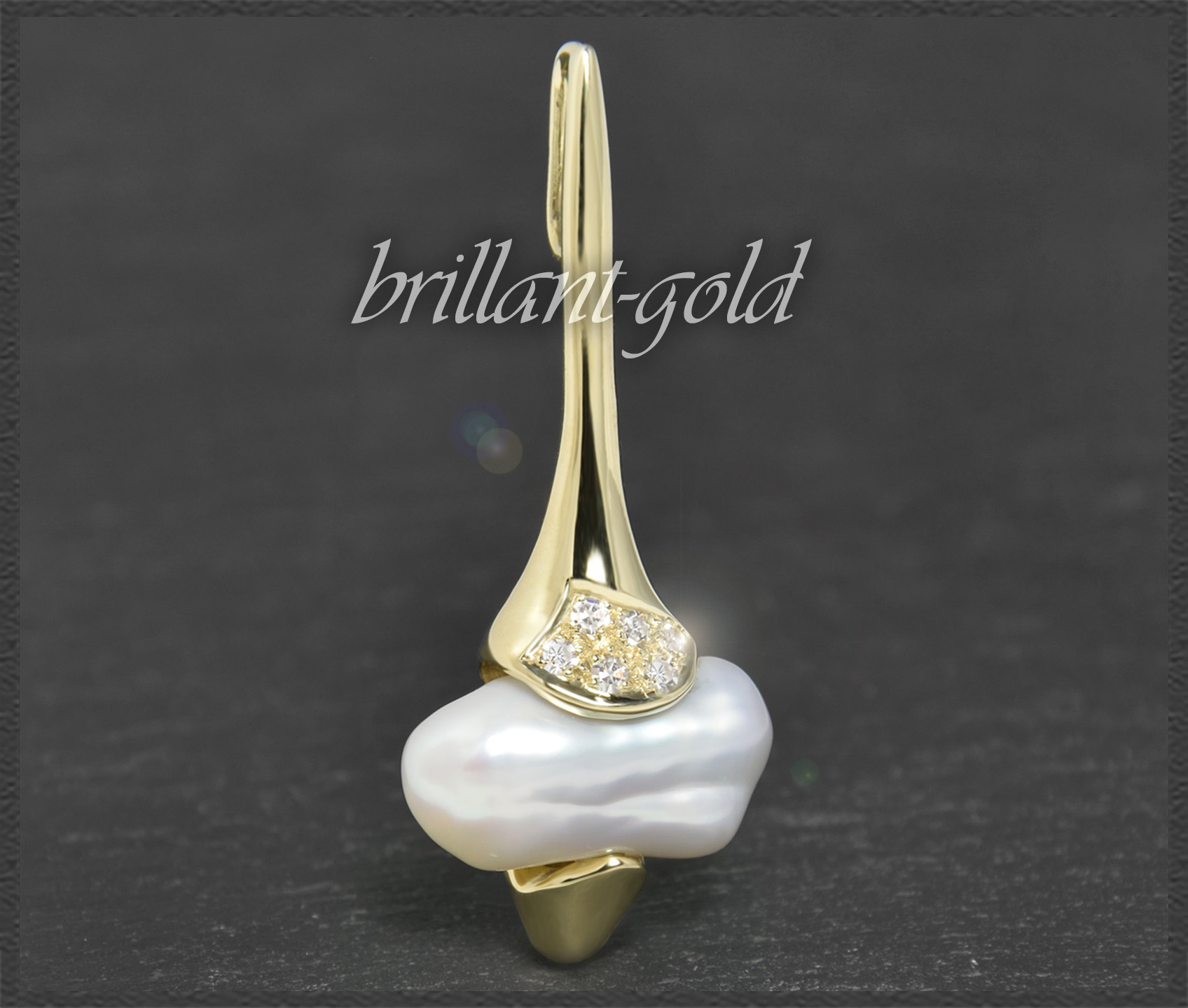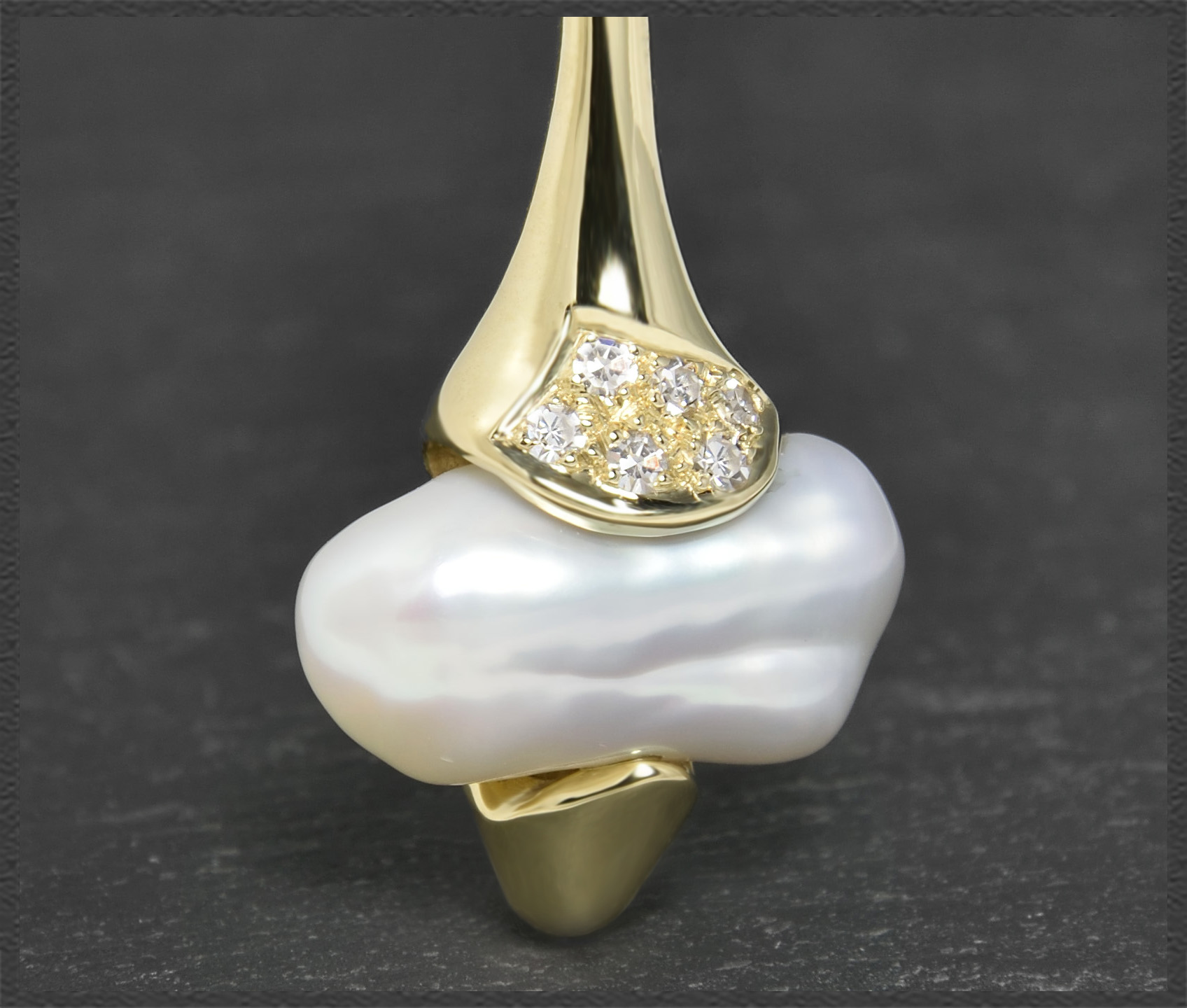 Gefasst ist eine große weiße Naturperle, die von 0,20ct funkelnden Diamanten verziert wird. Ehemals sehr teure Einzelanfertigung.
