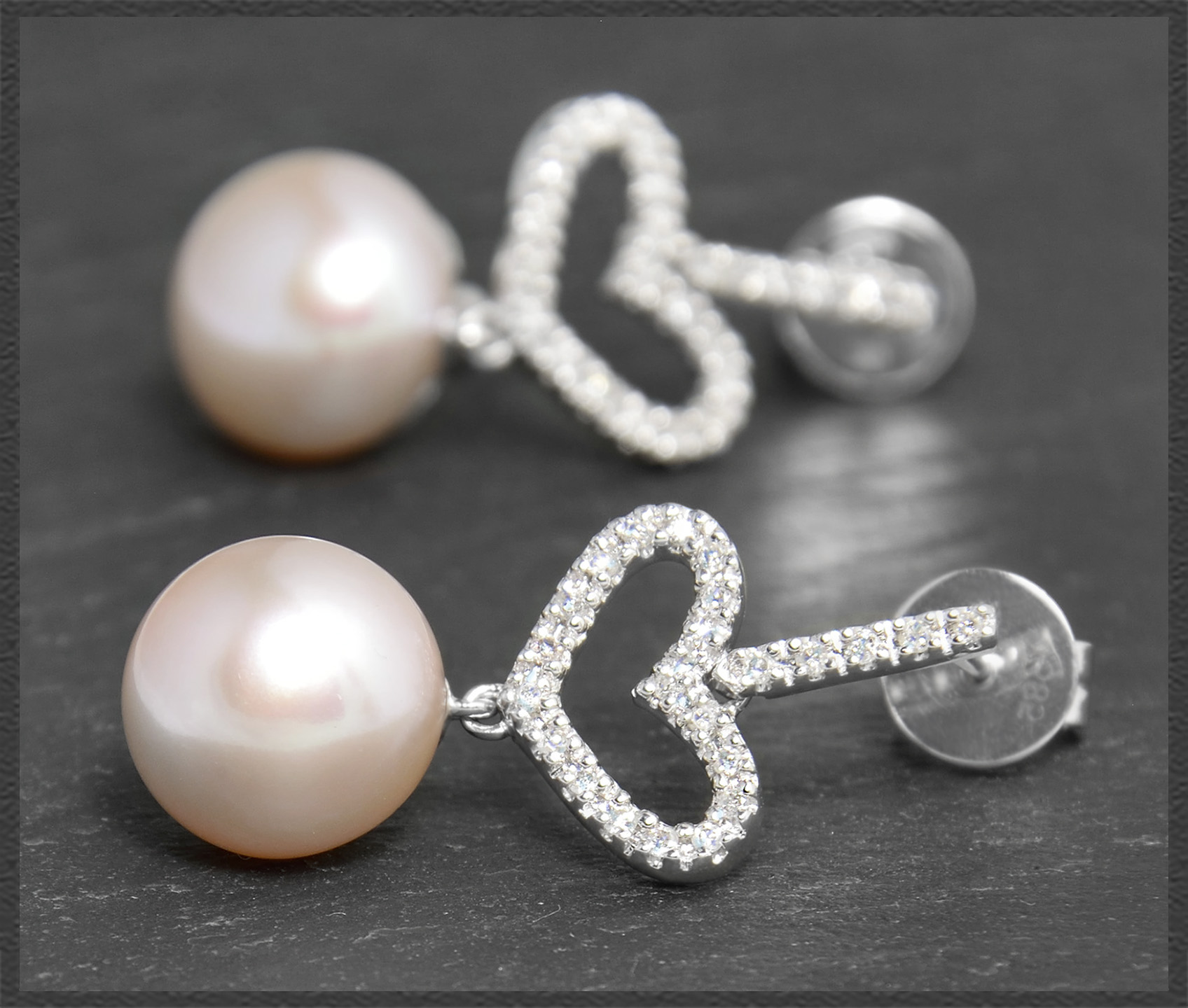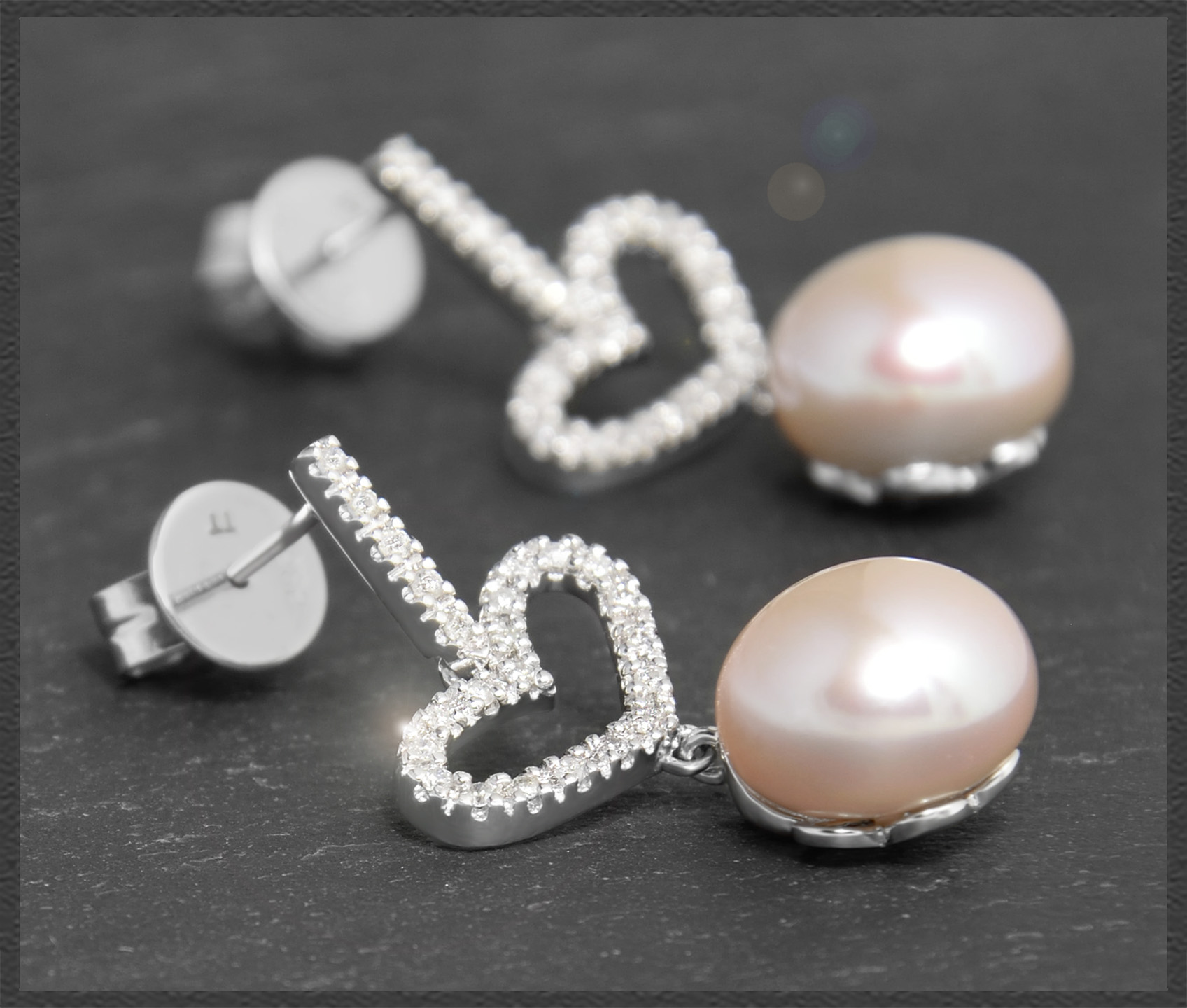 46 funkelnde Brillanten sind in den Ohrringen eingefasst, am unteren Ende zieren 2 hell-rosa Akoyaperlen das Schmuckstück.
