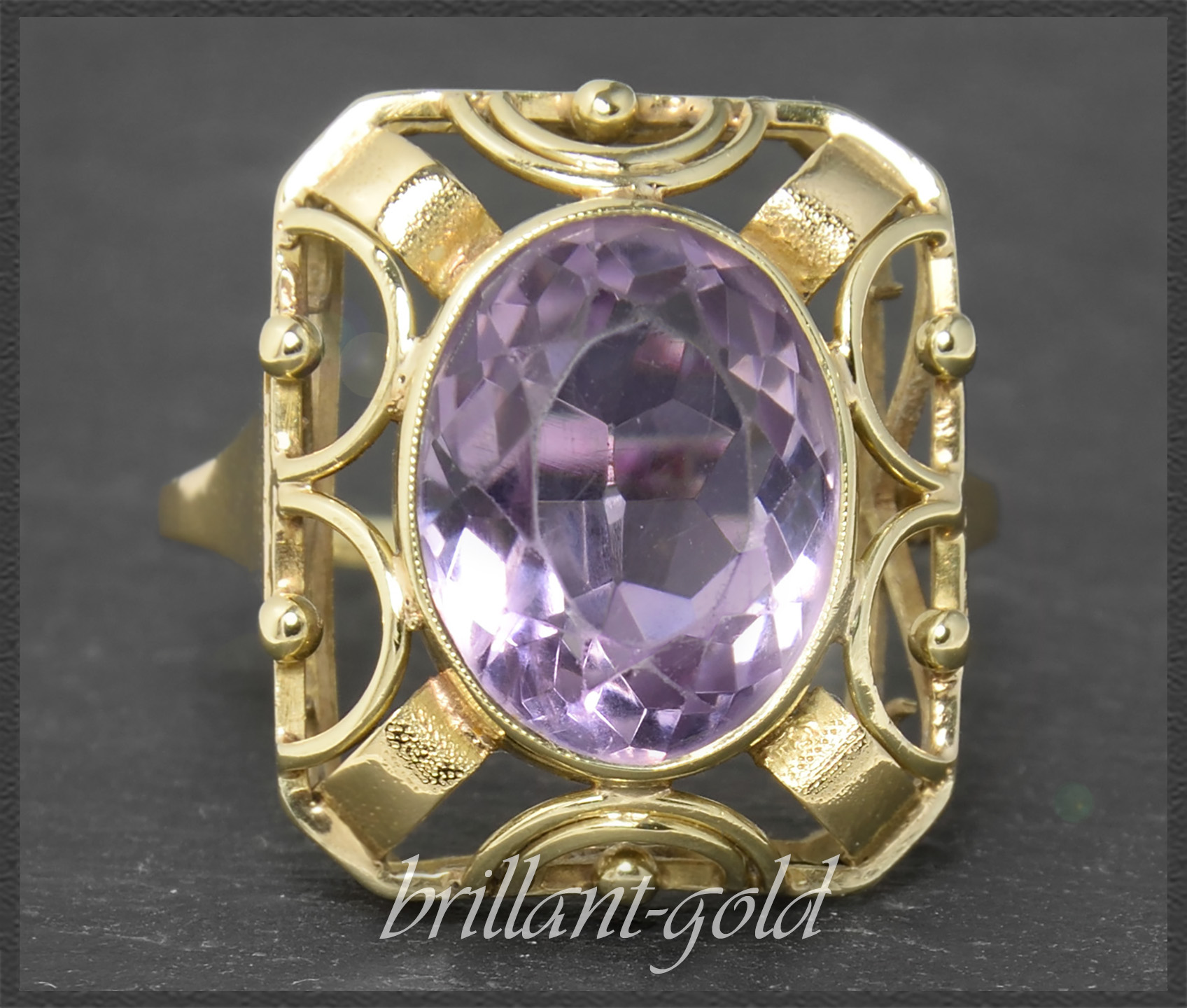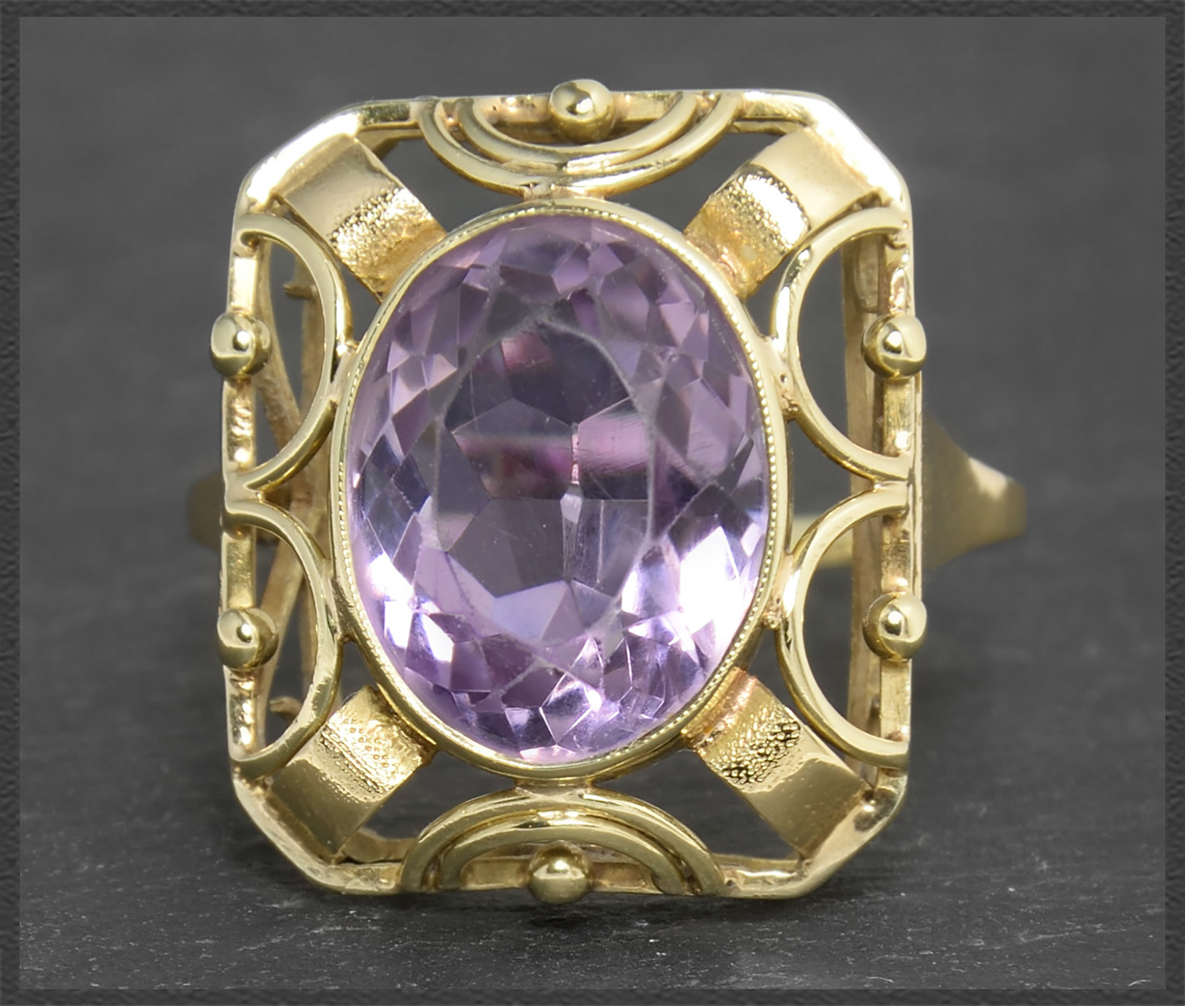 Als zentraler Solitär ist ein großer lila Amethyst mit 14,5 x 11,5 mm eingefasst. Rund um den Edelstein ist der Ring mit diversen handgefertigten Goldverzierungen geschmückt.