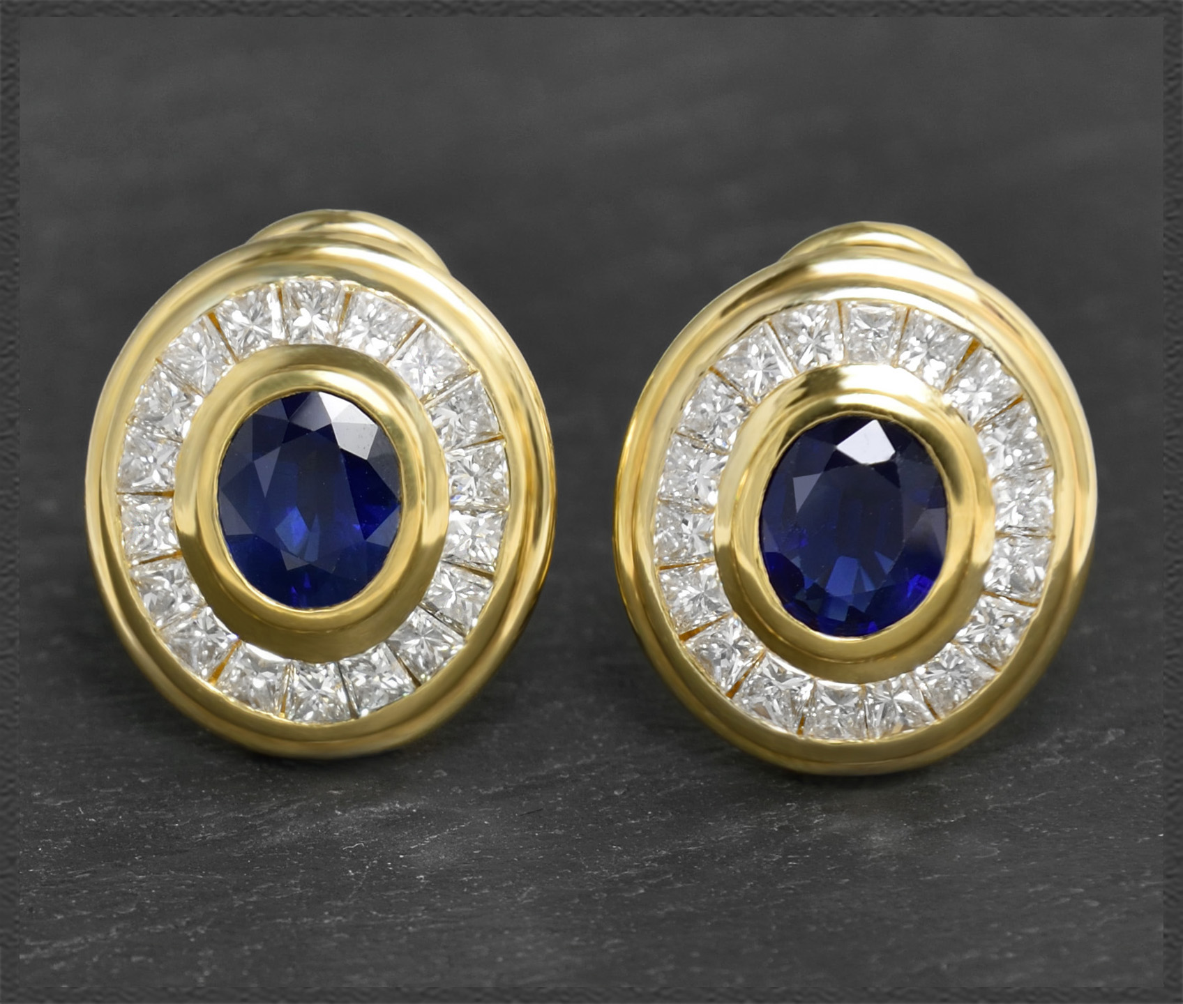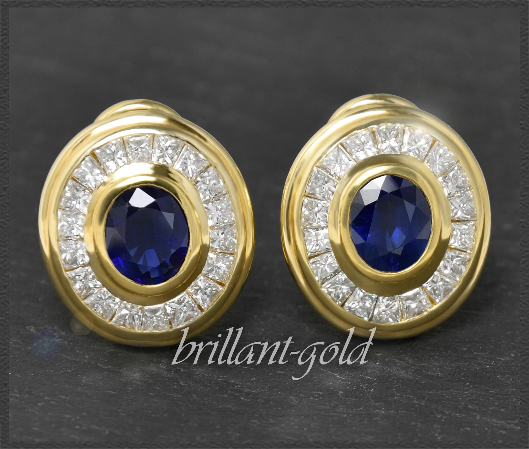 Zentral in den Ohrringen eingefasst sind zwei intensiv blaue Saphire im Ovalschliff, die rundherum von 36 hochwertigen Princess-Schliff Diamanten in TOP Qualität mit zusammen 2,40ct verziert werden. Die Diamanten haben einen exzellenten Princess-Schliff, sie betonen durch den Farbkontrast die blaue Farbe der Saphire und sie funkeln traumhaft schön im Licht.