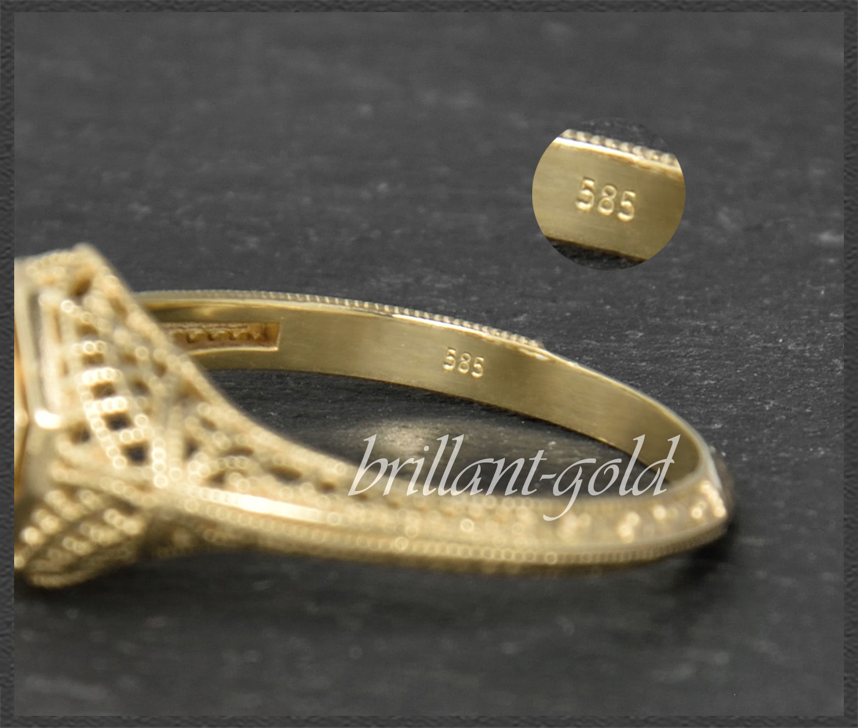 Antik Jugendstil Design Ring mit vielen filigranen Verzierungen. Fast der ganze Ring ist aus dünnen, millgriff Golddrähten gefertigt und er sieht dadurch sehr fein aus. Hergestellt aus massivem 585 Gelbgold, hochglanz-polierte Oberfläche.