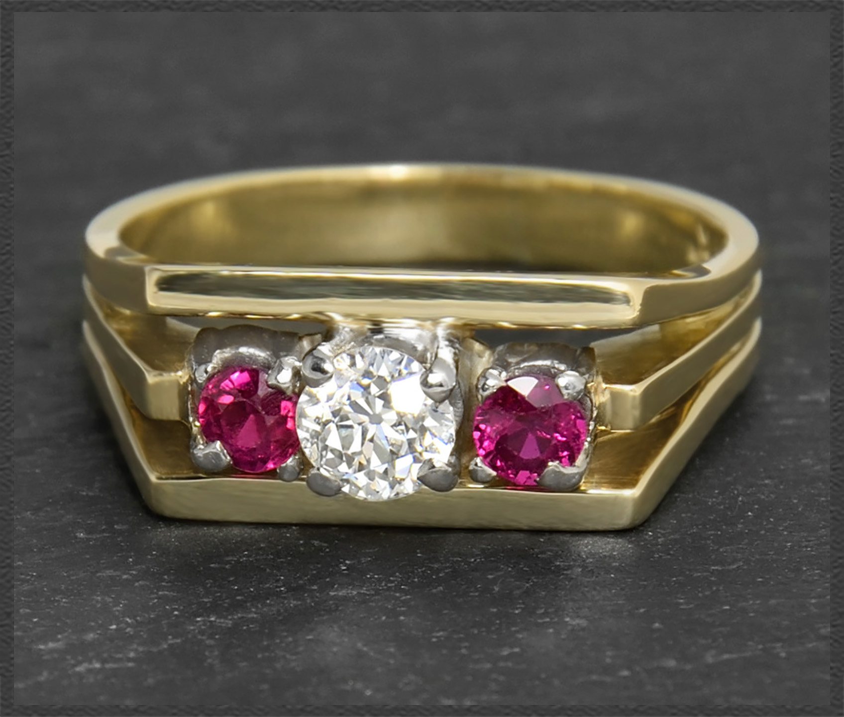 Eleganter 0,92ct Diamant & Rubin Trilogie Ring, original Vintage Schmuckstück, gefertigt um 1970.