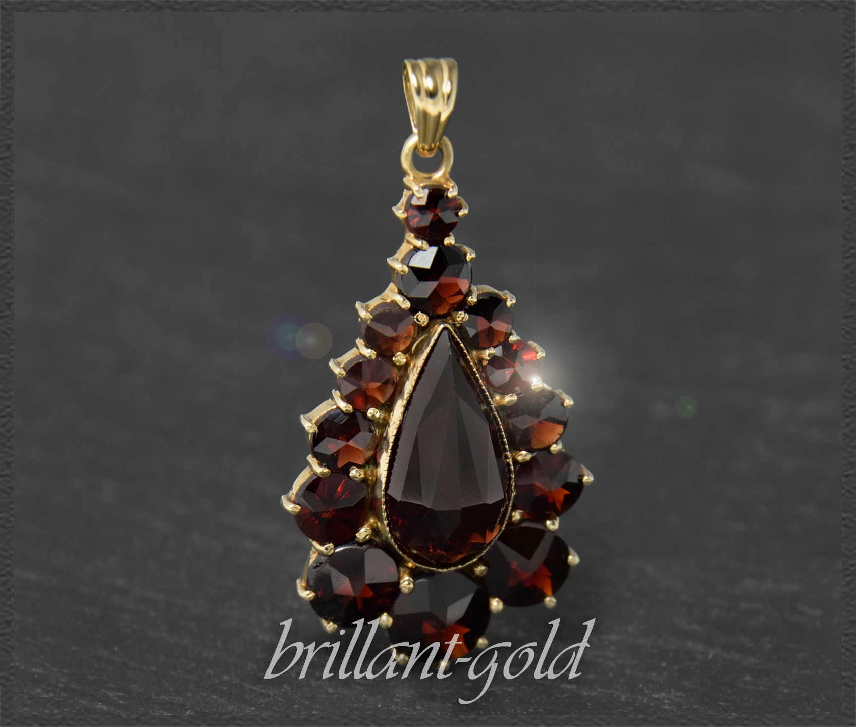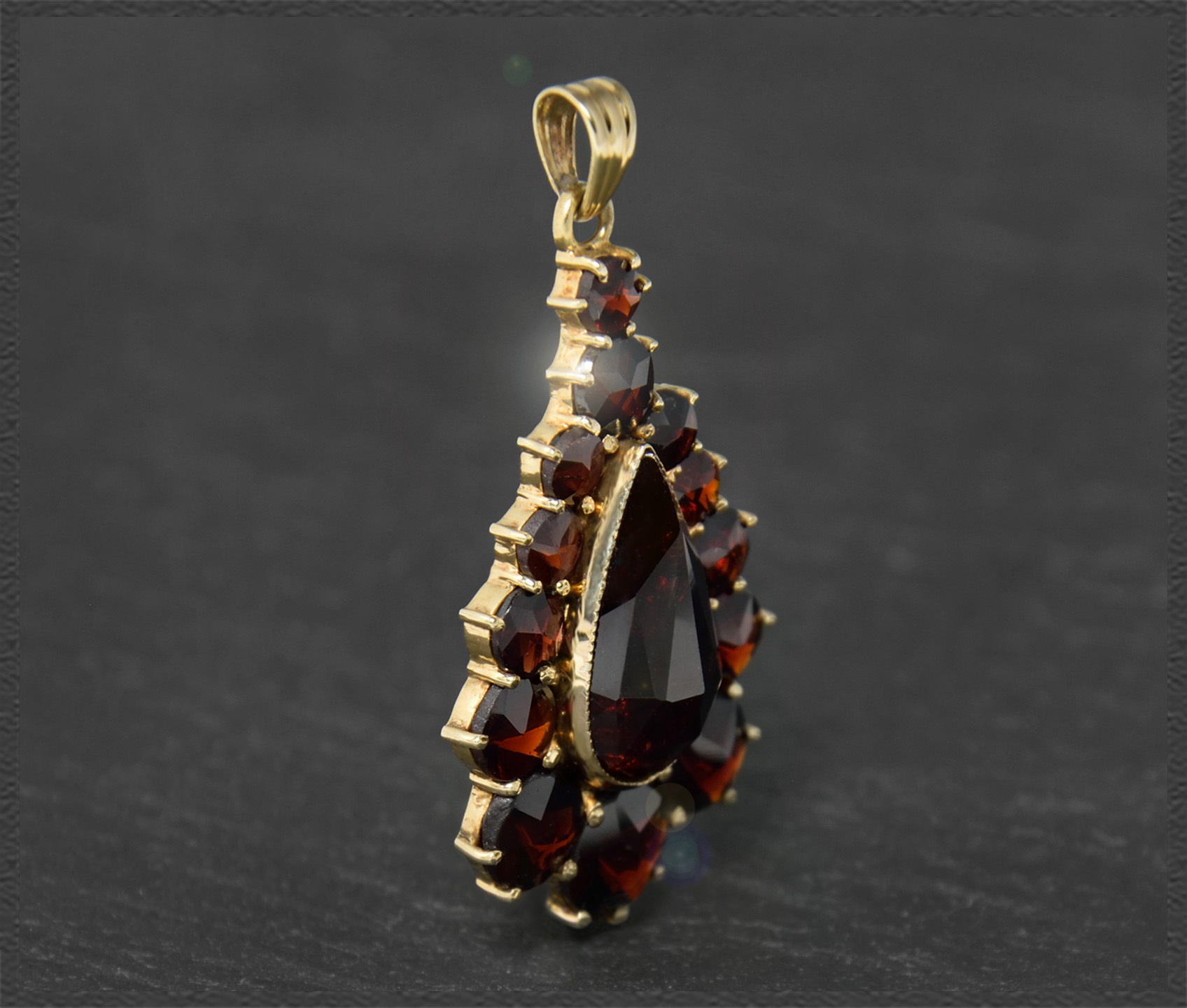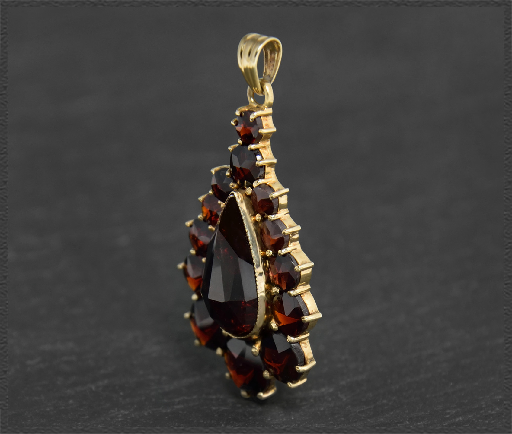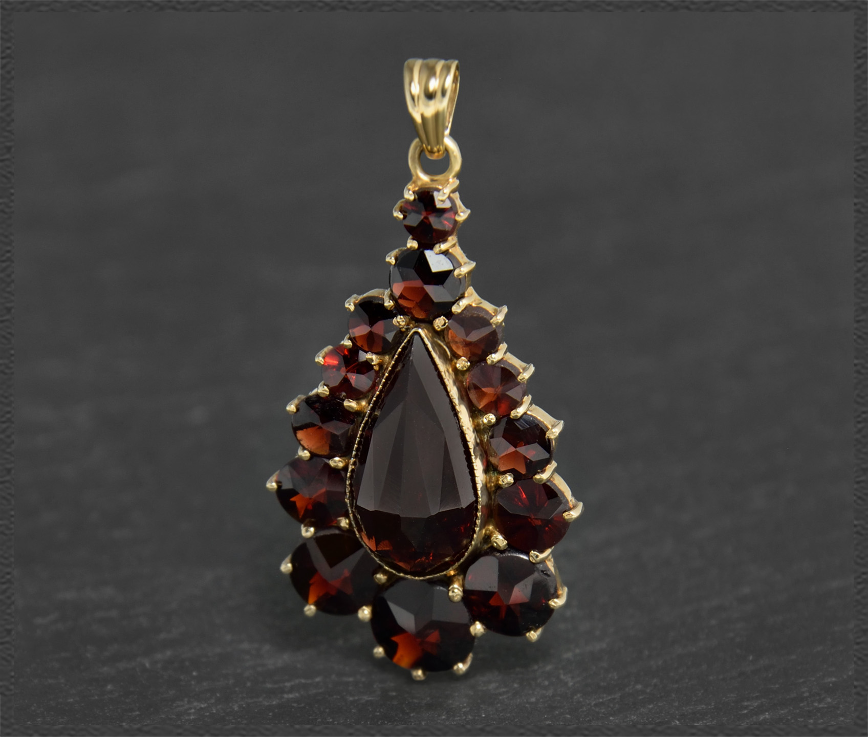 Ein großer Granat im Tropfenschliff mit 15x8mm wird rundherum von runden Granaten geschmückt. Böhmische Granate mit eleganter dunkelroter Farbe.
