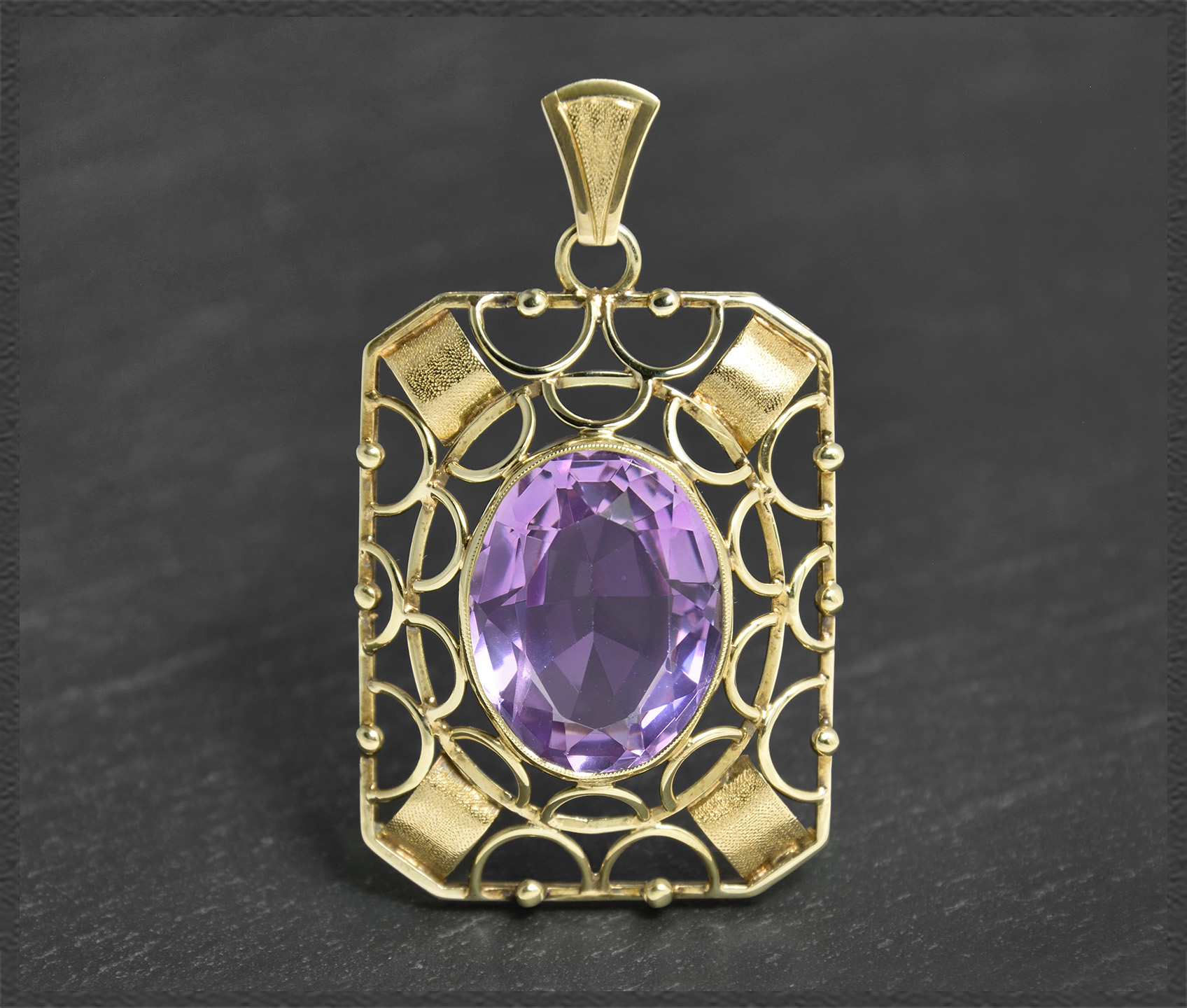 Aufwendig gestalteter Gold Anhänger mit schönen Verzierungen. Zentral im Anhänger eingefasst ist ein sehr schöner & großer violetter Amethyst.