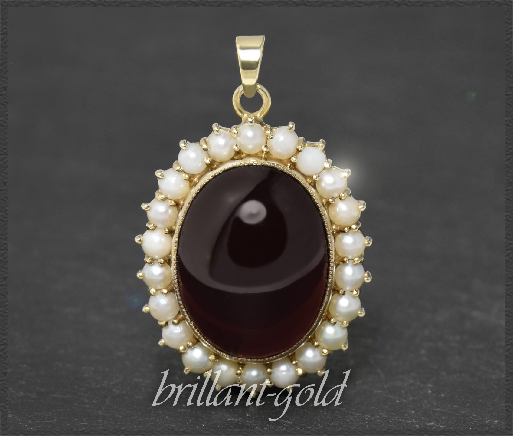 Außergewöhnlicher Vintage Anhänger, besetzt mit 22 weißen Perlen & einem großen, dunkelroten Granat im Cabochon-Schliff mit 21ct.
