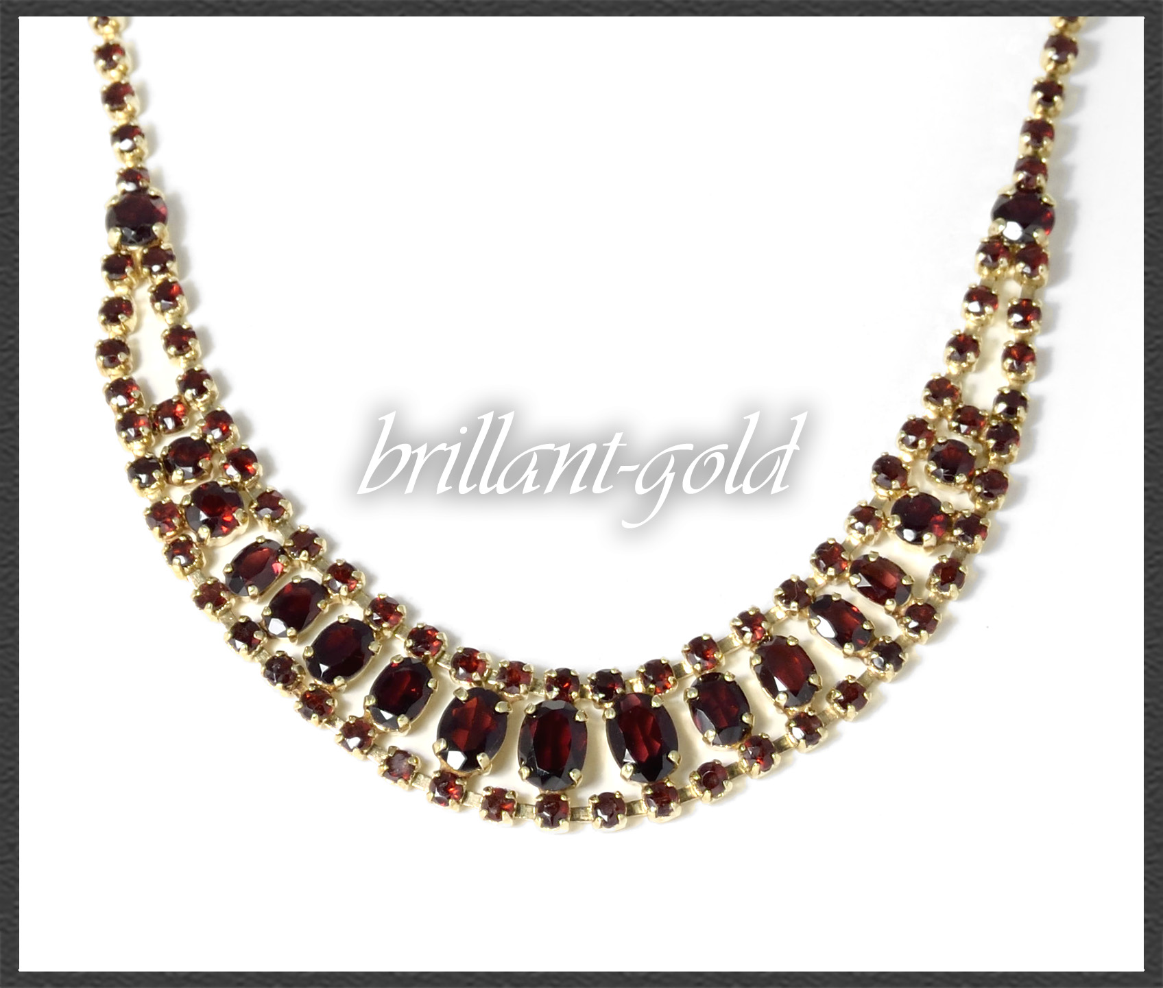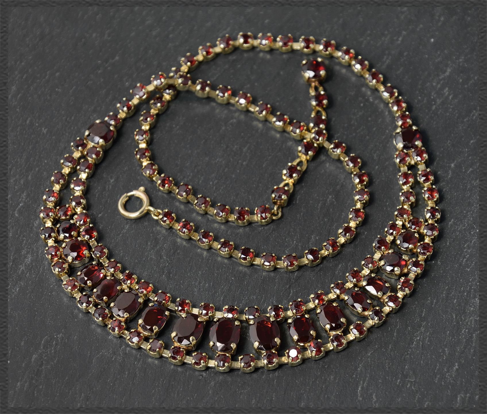 Am gesamten Collier sind kleinere 3,10mm Granate eingefasst, das 2-Reihige Mittelteil zieren zusätzlich runde & ovale Granate im Größenverlauf.