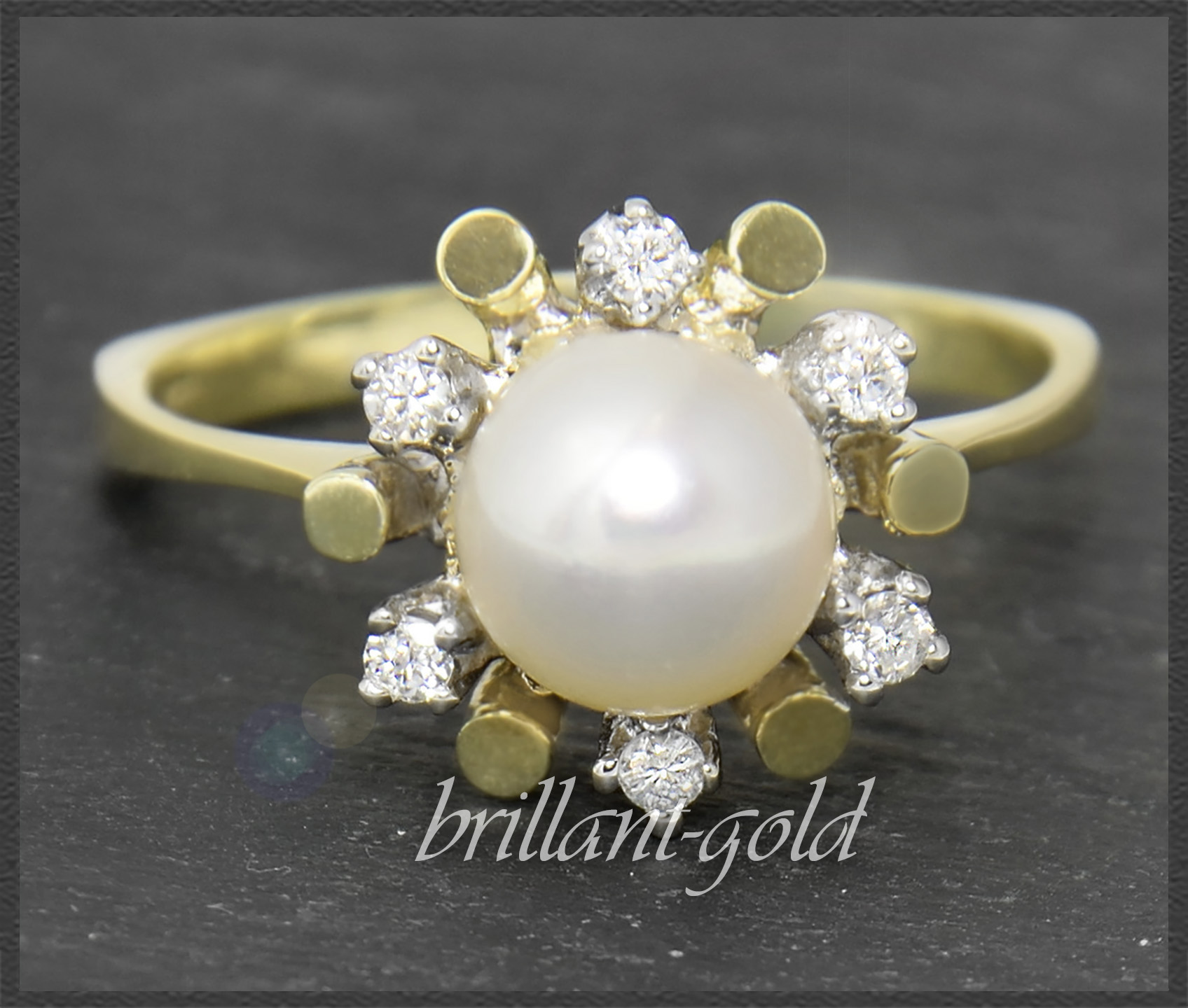 Eine große weiße Perle mit 8mm Durchmesser und sehr schönem Luster ist zentral im Ring eingefasst. Rundherum wird sie von 6 Brillanten verziert, die alle in Weißgold gefasst sind, wodurch die Brillant-Verzierung sternenförmig aussieht. Die Diamanten haben eine sehr gute Qualität und sie funkeln alle wunderschön im Licht.