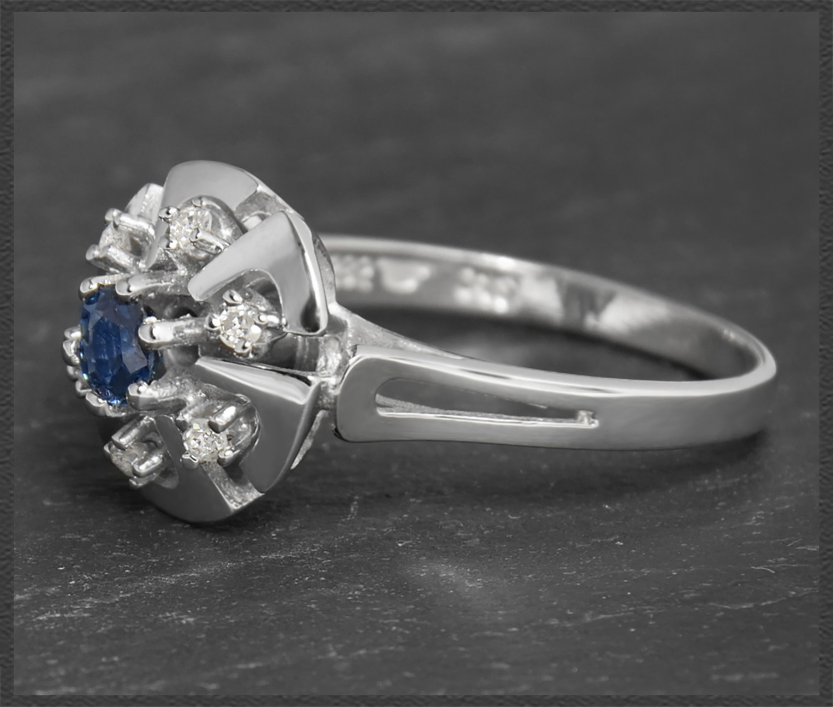 Zentral eingefasst ist ein schöner, blauer Saphir. Er wird rund herum von sechs hochwertigen & schön funkelnden Diamanten mit zusammen 0,12ct (punziert & von uns überprüft) verziert.