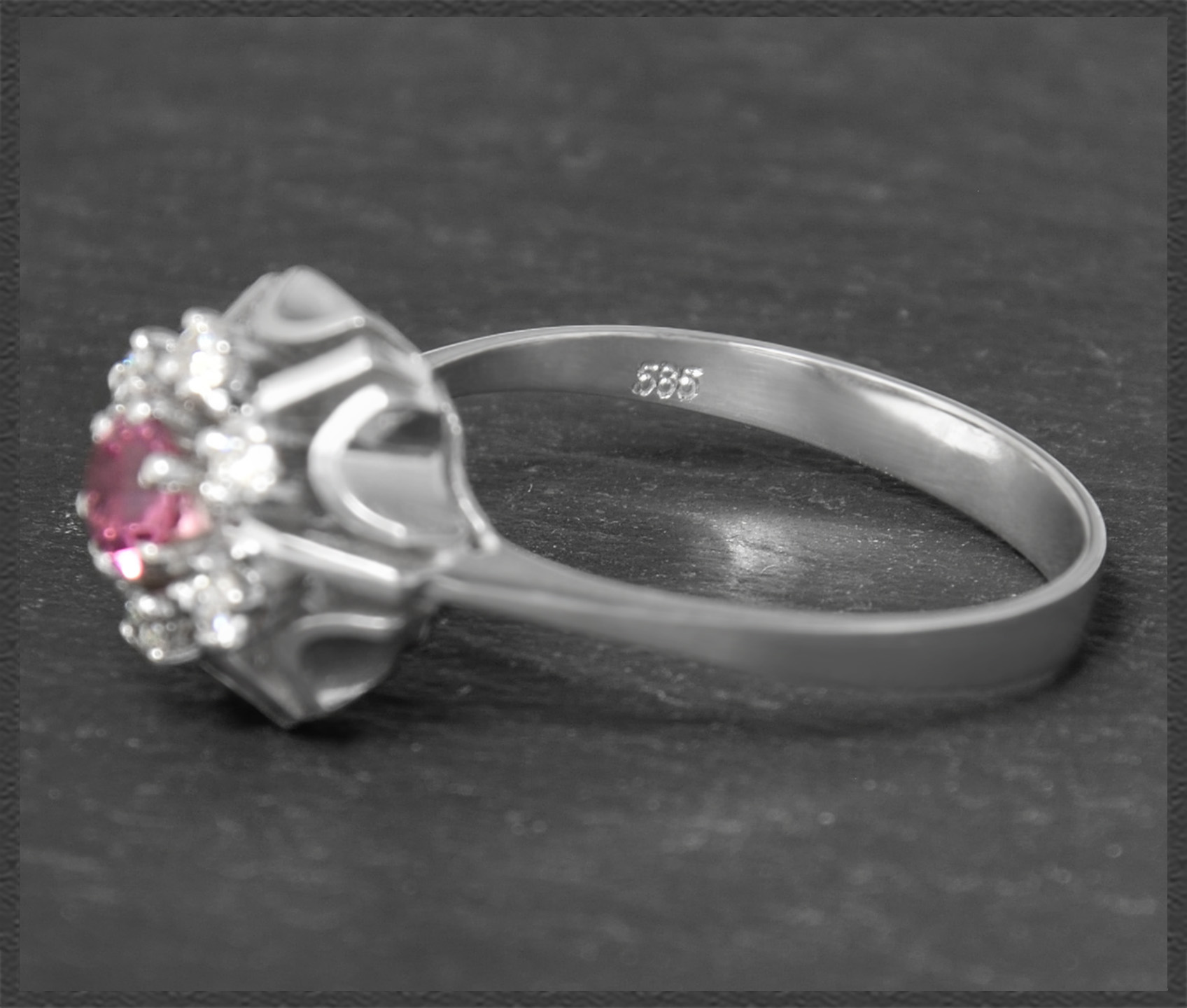 Zentral ist ein leuchtend pinker Spinell in hoher Qualität eingefasst. Rundherum funkelnden sechs hochwertige Brillanten in bester Farbe & bester Reinheit (River & Lupenrein) mit zusammen 0,27ct wunderschön im Licht.