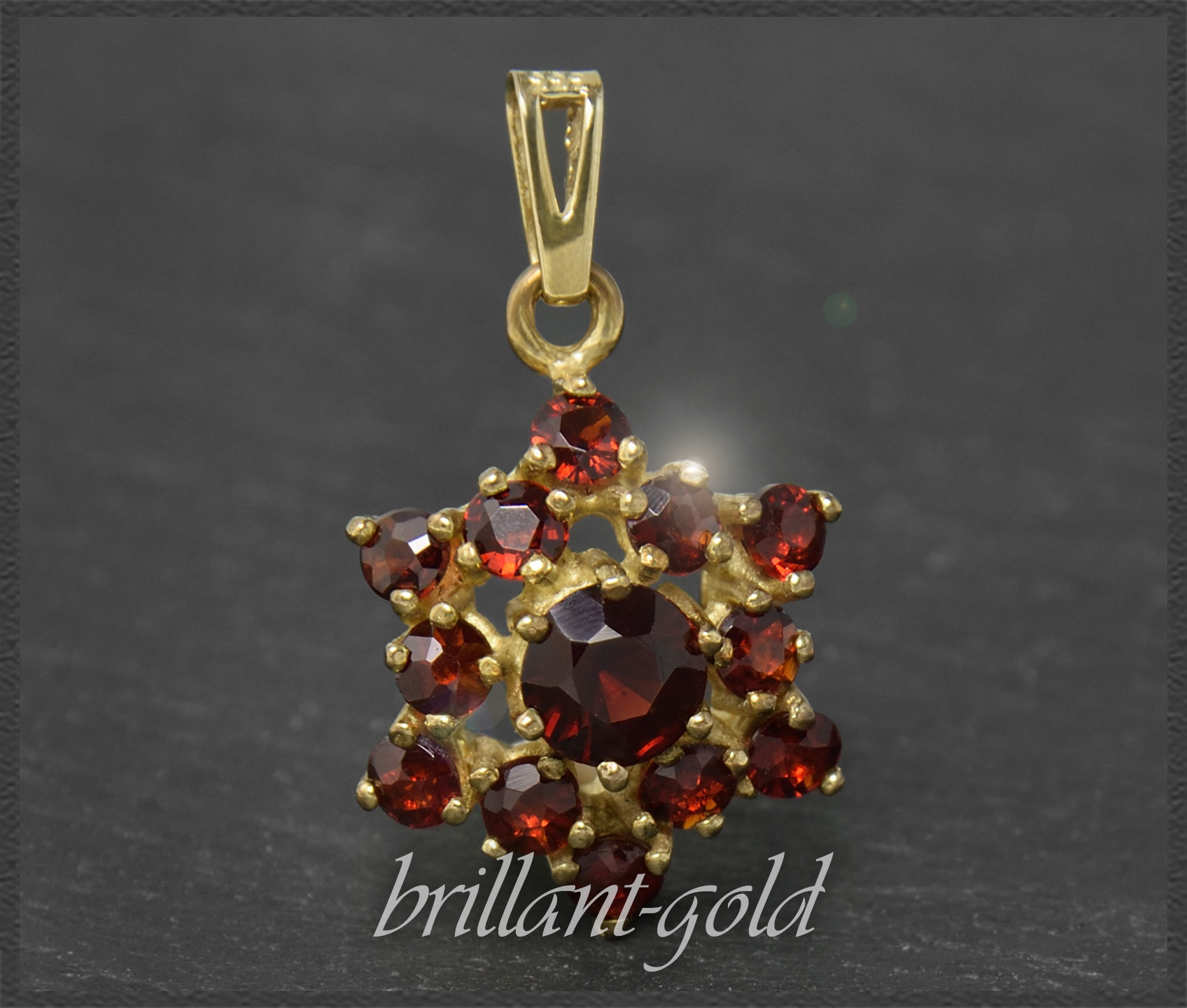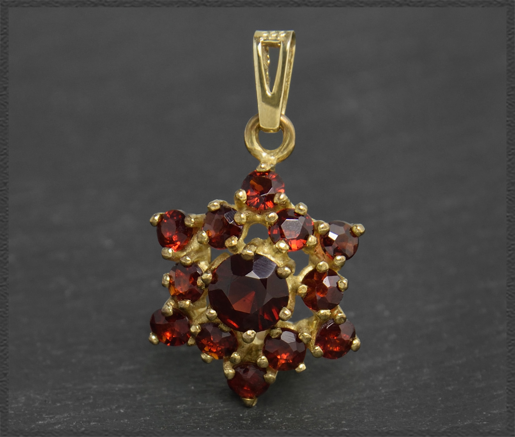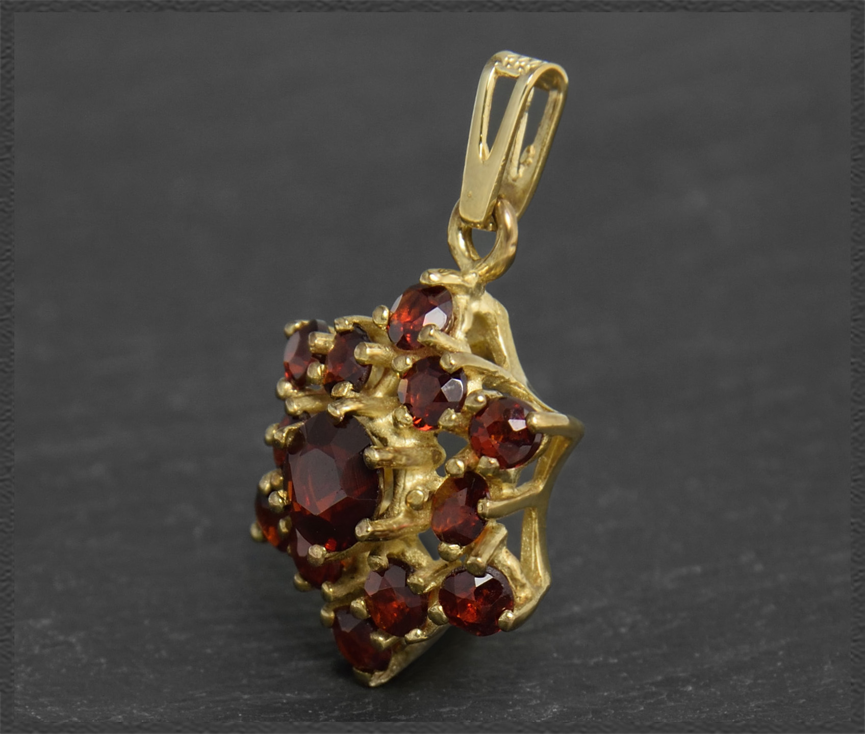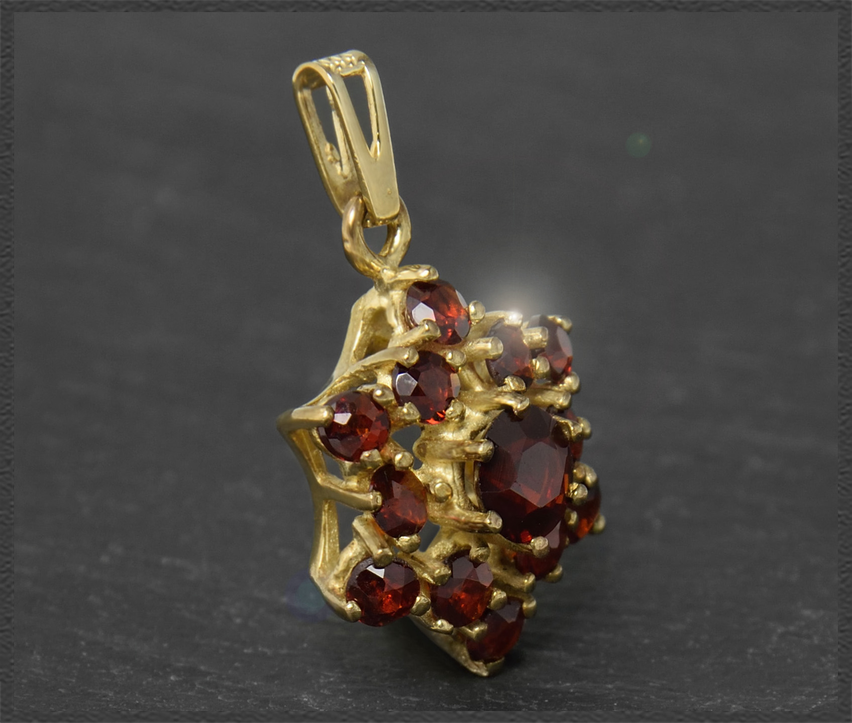 Vintage (um 1960) Granat Anhänger mit 2,10ct hochwertigen böhmischen Granaten, gefertigt in Handarbeit (Goldschmiedpunze im Schmuckstück) aus massivem 333 Gelbgold.