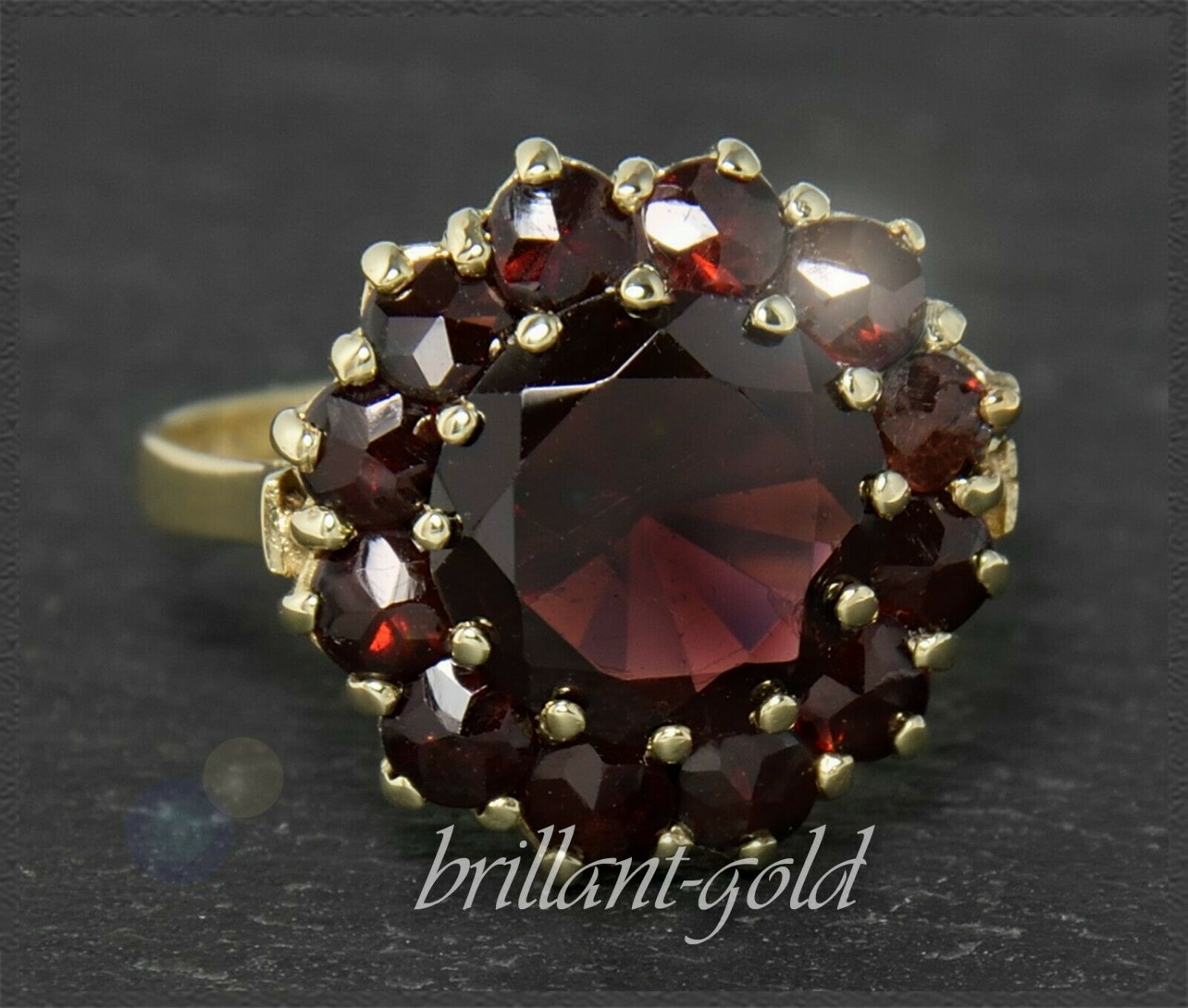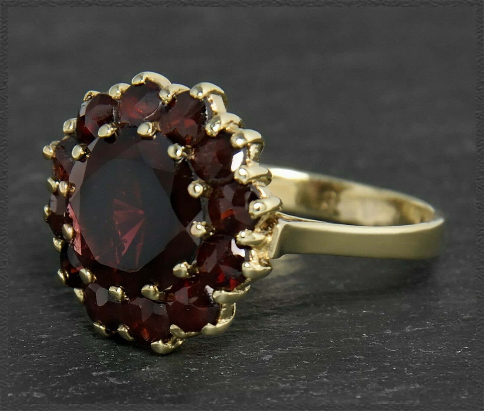 Besetzt ist der Ring mit einem großen runden Granaten mit 10mm, der rundherum von kleineren Granaten verziert wird.